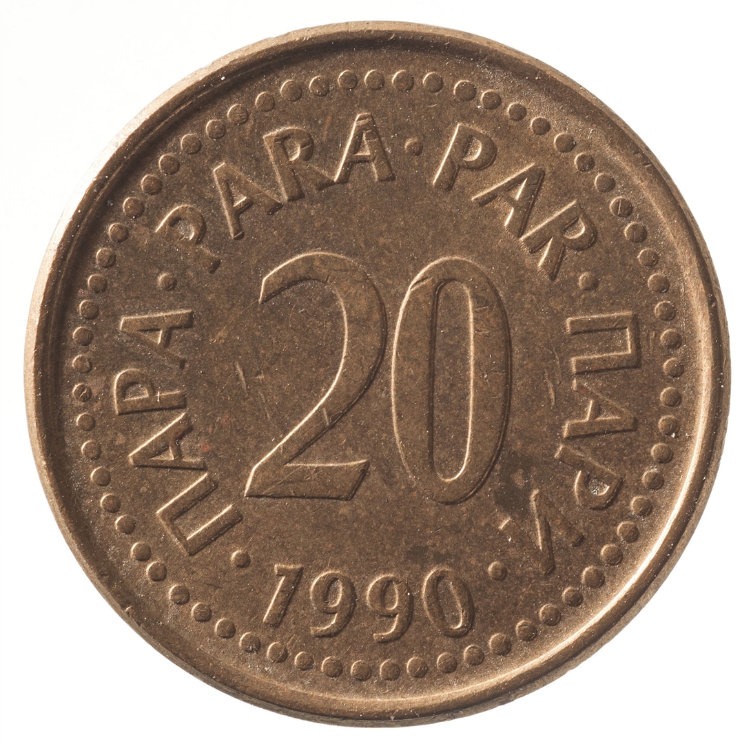 Avers: U sredini državni grb. U oko njega uz rub polukružno napisan tekst SFR JUGOSLAVIJA na latinici i ćirilici. Revers: U sredini broj 20 (nominala), oko njega tekst PARA na četiri jezika, a ispod toga godina 1990.