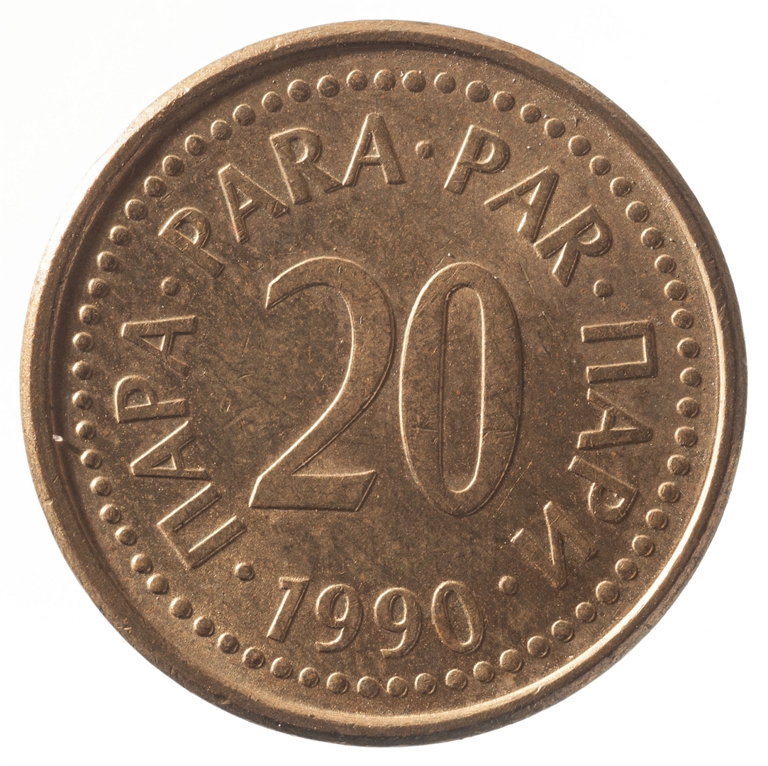 U sredini broj 20 (nominala), oko njega tekst PARA na četiri jezika, a ispod toga godina 1990.