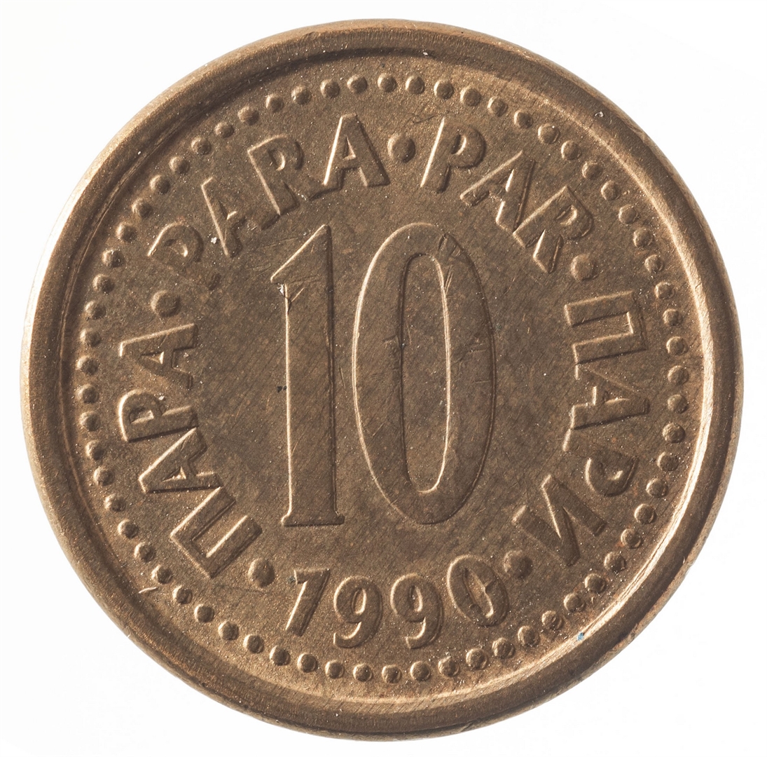 U sredini broj 10 (nominala), oko njega tekst PARA na četiri jezika, a ispod toga godina 1990.