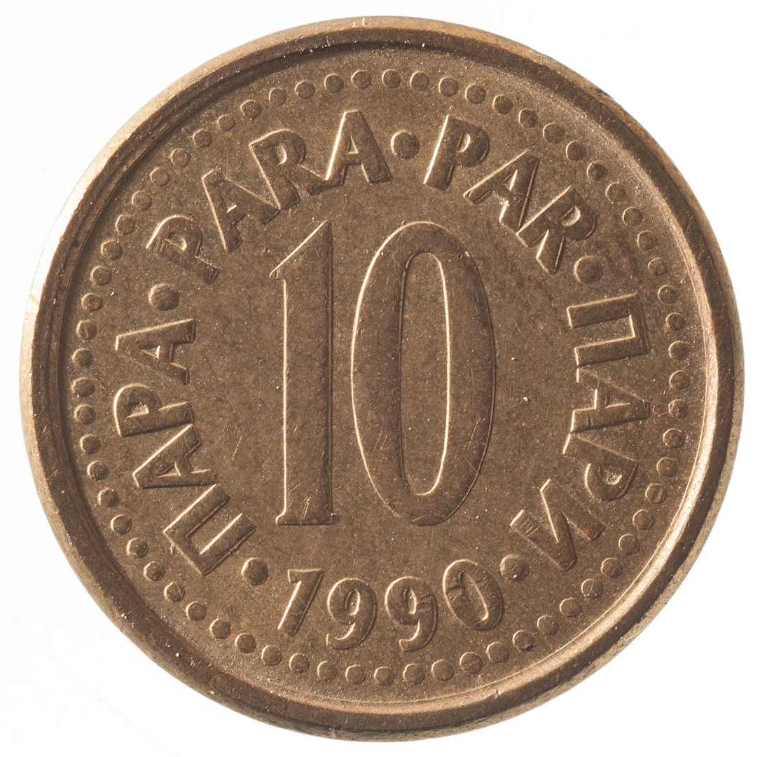U sredini broj 10 (nominala), oko njega tekst PARA na četiri jezika, a ispod toga godina 1990.