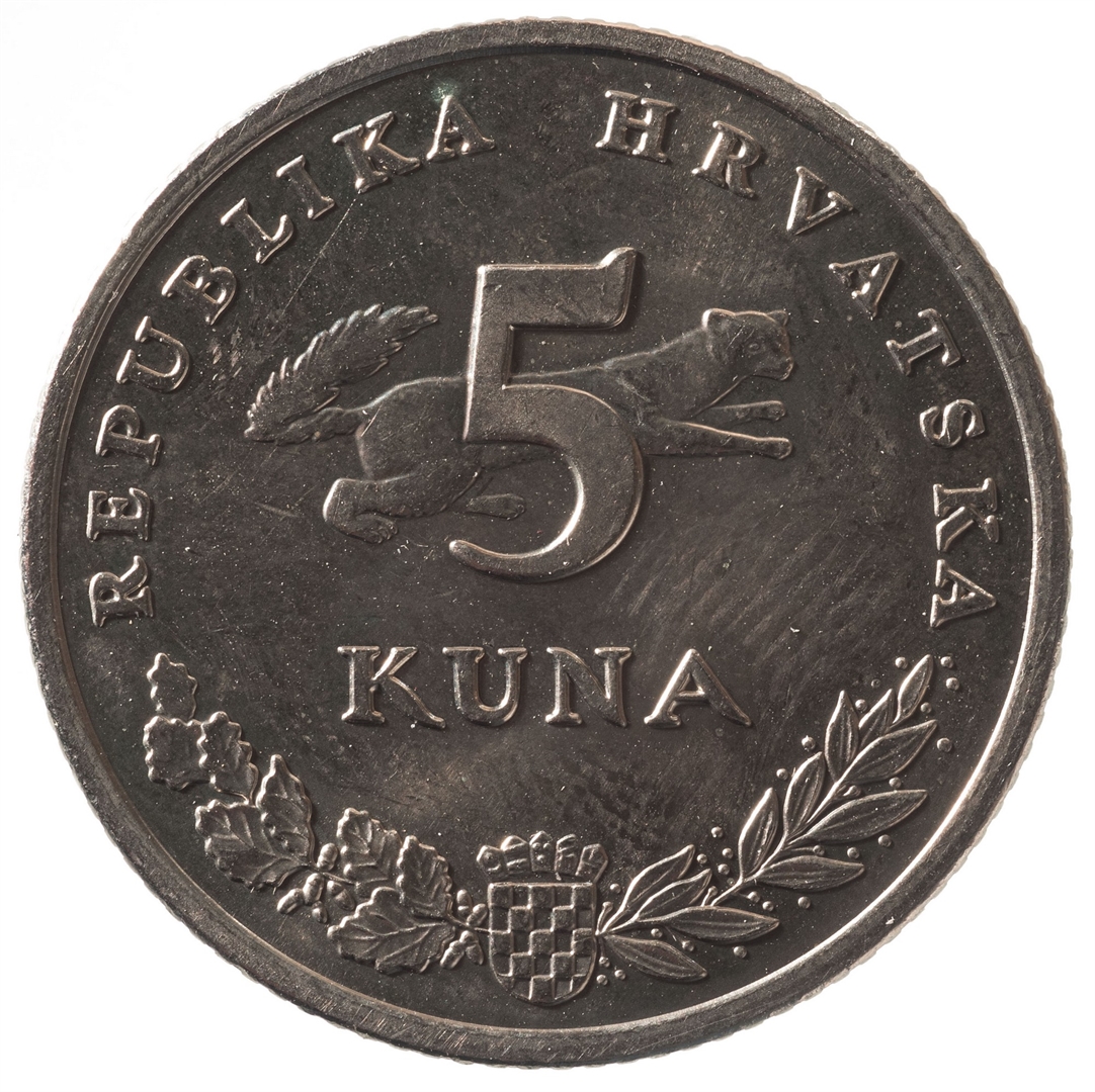 Avers: U središnjem dijelu nominala "5 KUNA", a u pozadini prikaz kune zlatice, zvijeri iz porodice kuna, skupocjena krzna, u trku nadesno. U gornjem polukrugu, uz rub, natpis "REPUBLIKA HRVATSKA". Uz donji rub, u središnjem dijelu, prikaz grba Republike Hrvatske. Lijevo od grba, polukružno uz rub, stilizirani je prikaz grančice hrasta lužnjaka s plodom, a desno, također polukružno uz rub, stilizirani je prikaz lovorove grančice u cvatu. Revers: U središnjem dijelu prikaz mrkog medvjeda u pokretu, najveće zvijeri sa staništem u Republici Hrvatskoj. Uz donji rub, u središnjem dijelu, godina kovanja. Lijevo od istaknute godine kovanja, polukružno uz rub djelomično omeđuje prikaz medvjeda natpis "MRKI MEDVJED".