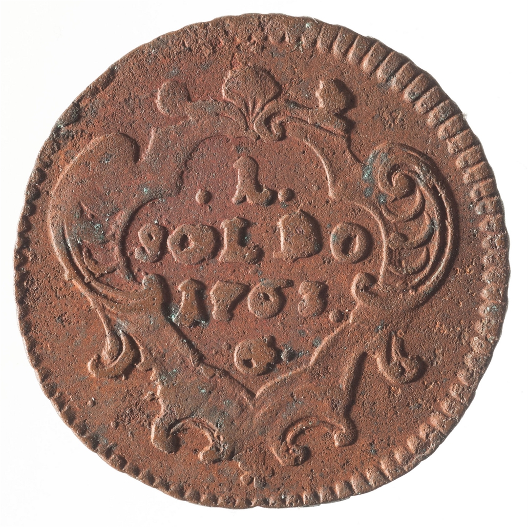 U sredini unutar ukrašenog okvira nalazi se oznaka vrijednosti novca 1 Soldo. Ispod nje nalazi se godina 1763 i oznaka kovnice G.
