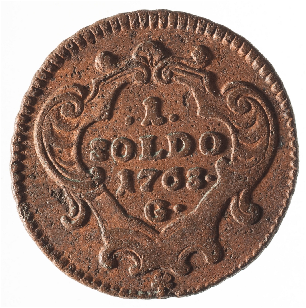 U sredini unutar ukrašenog okvira nalazi se oznaka vrijednosti novca 1 Soldo. Ispod nje nalazi se godina 1763 i oznaka kovnice G.