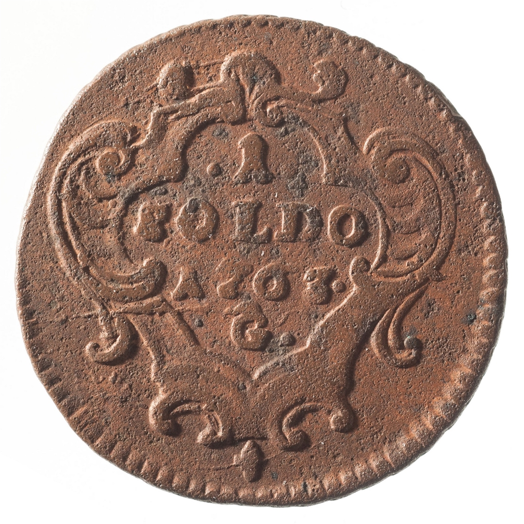 U sredini unutar ukrašenog okvira nalazi se oznaka vrijednosti novca 1 Soldo. Ispod nje nalazi se godina 1763 i oznaka kovnice G.