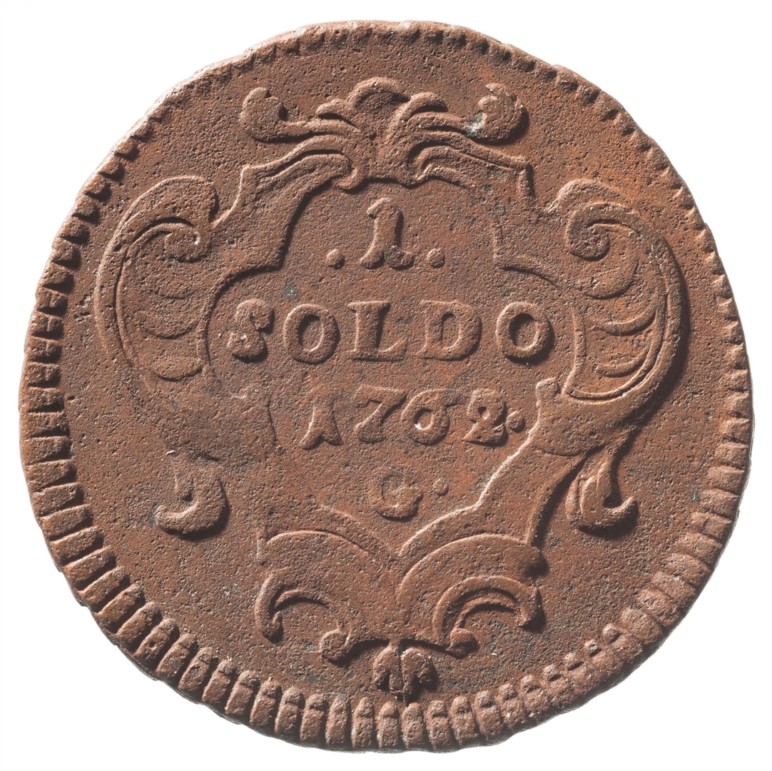 U sredini unutar ukrašenog okvira nalazi se oznaka vrijednosti novca 1 Soldo. Ispod nje nalazi se godina 1762 i oznaka kovnice G.