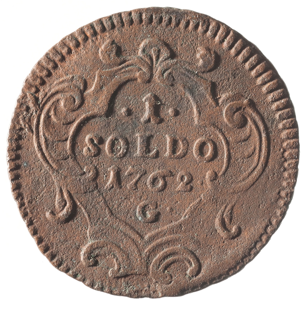 U sredini unutar ukrašenog okvira nalazi se oznaka vrijednosti novca 1 Soldo. Ispod nje nalazi se godina 1762 i oznaka kovnice G.