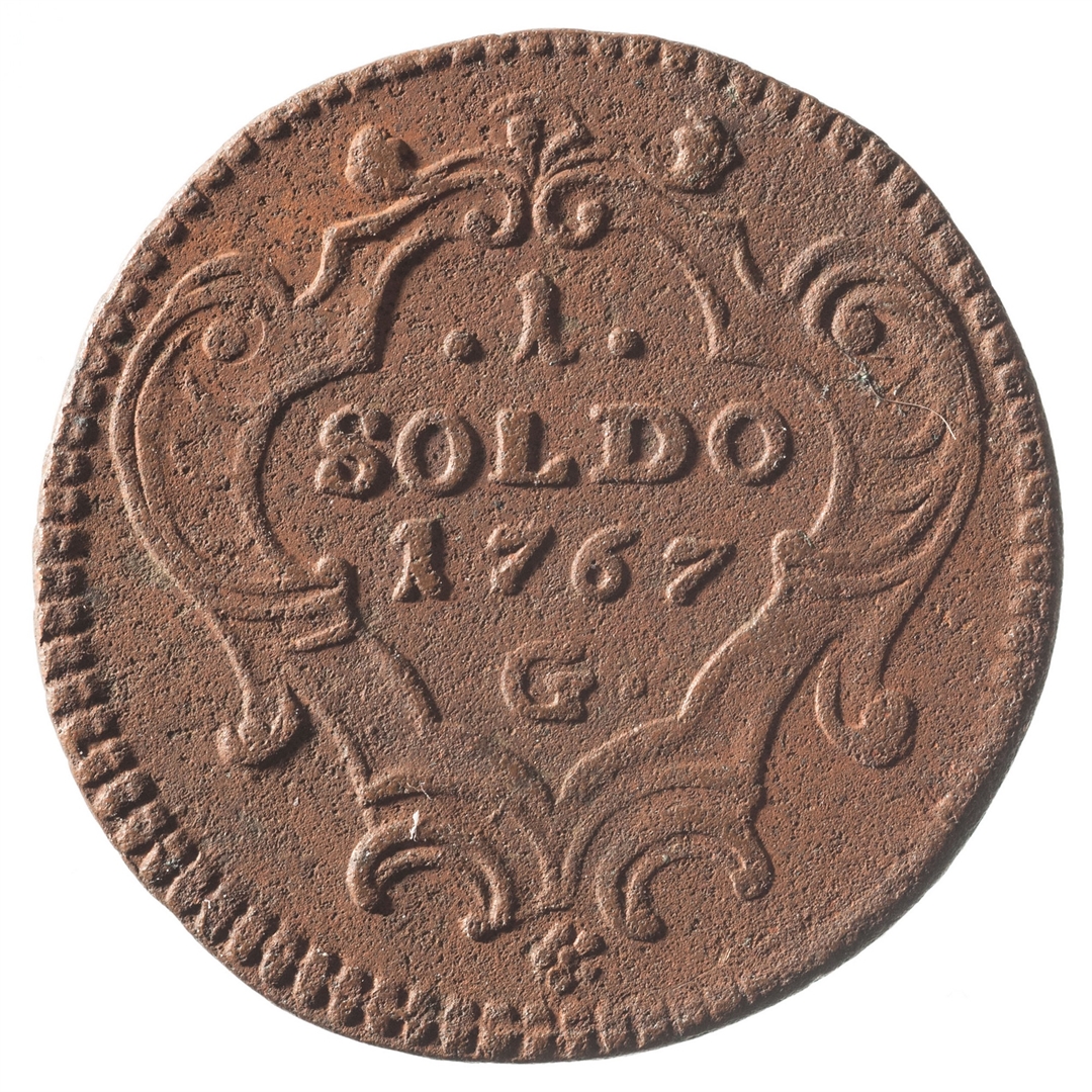 U sredini unutar ukrašenog okvira nalazi se oznaka vrijednosti novca 1 Soldo. Ispod nje nalazi se godina 1767 i oznaka kovnice G.