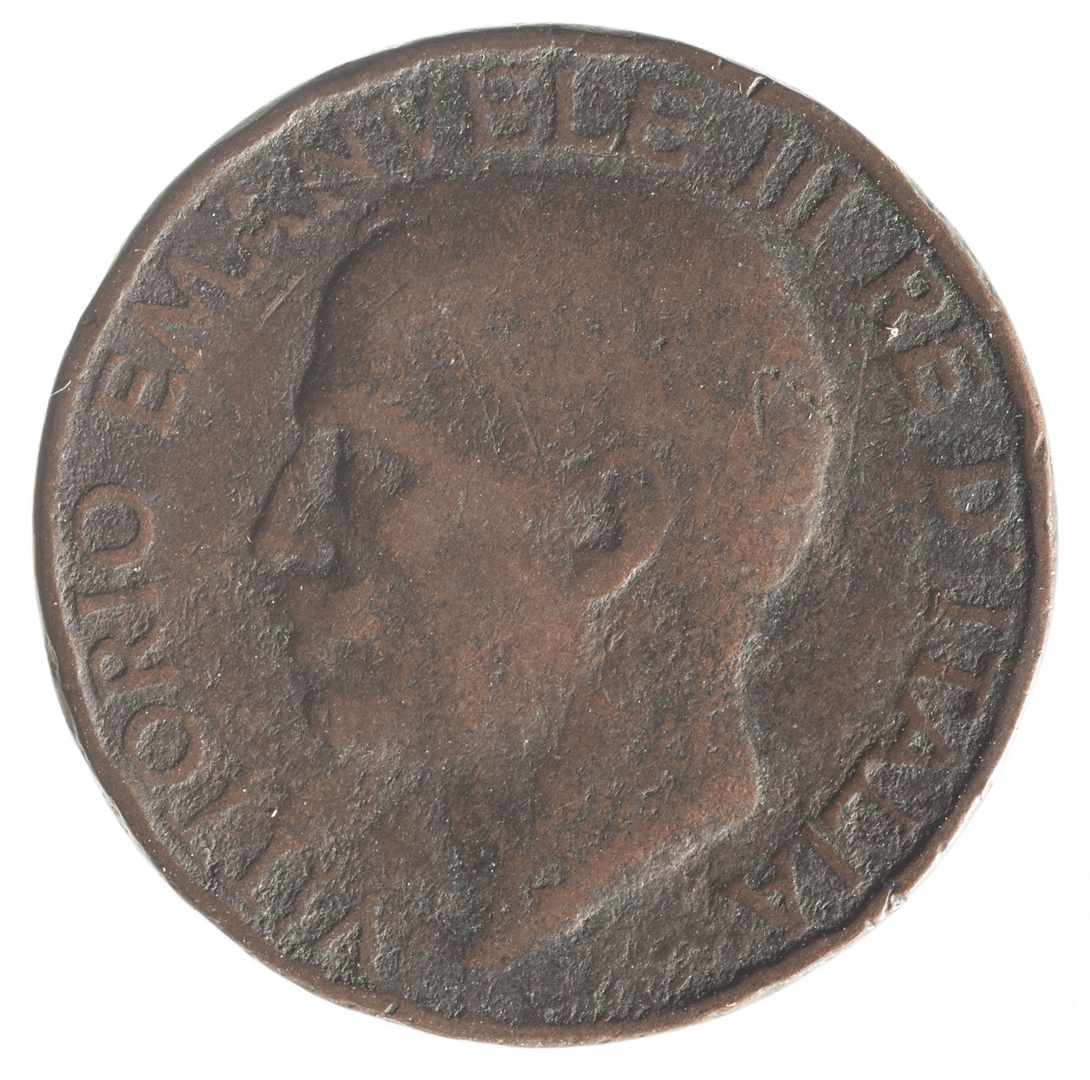 Centralni dio kovanice zauzima profil osobe sa pogledom u lijevo. Uz rub cijele kovanice proteže se natpis VITTORIO EMANVELE III RE D''ITALIA.