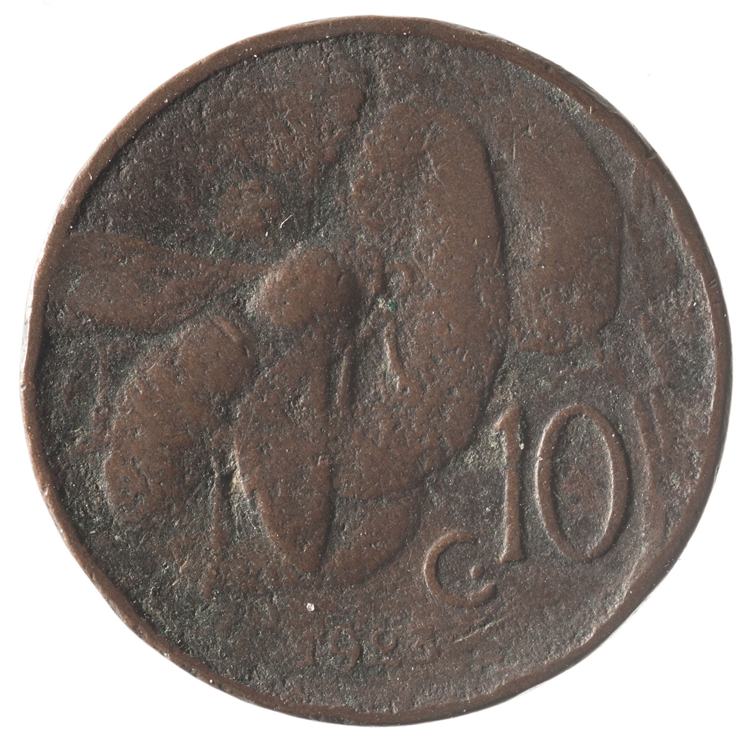 Dvije trećine površine zauzima prikaz pčele na cvijetu. Uz desni doljnji rub kovanice nalazi se natpis c10, a uz lijevi donji rub veliko slovo R. Na samon dnu nalazi se godina 1923.