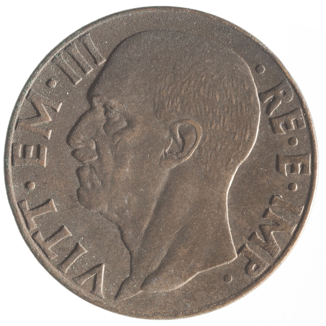 Centralni dio kovanice zauzima profil osobe sa pogledom u lijevo. Uz rub cijele kovanice proteže se natpis VITTORIO EMANVELE III RE D''ITALIA.