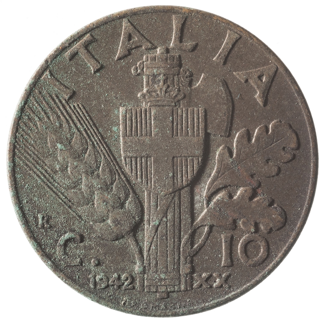 Centralno mjesto na kovanici zauzima fascio sa grbom. Iznad njega polukružno uz rub nalazi se natpis ITALIA, sa njegove lijeve strane smjestio se klas žita, a sa desne dva hrastova lista. Na dnu sa lijeve strane fascia nalazi se godina 1942., a sa njegove desne strane rimski broj XX.