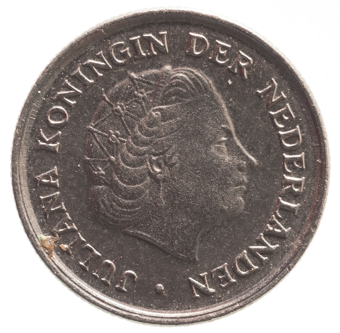 U sredini profil kraljice okrenut udesno. Kružno uz rub natpis JULIANA KONINGIN DER NEDERLENDEN.