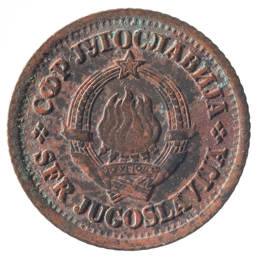 U sredini državni grb. U gornjem djelu uz rub polukružno napisan tekst SFR JUGOSLAVIJA na latinici i ćirilici.