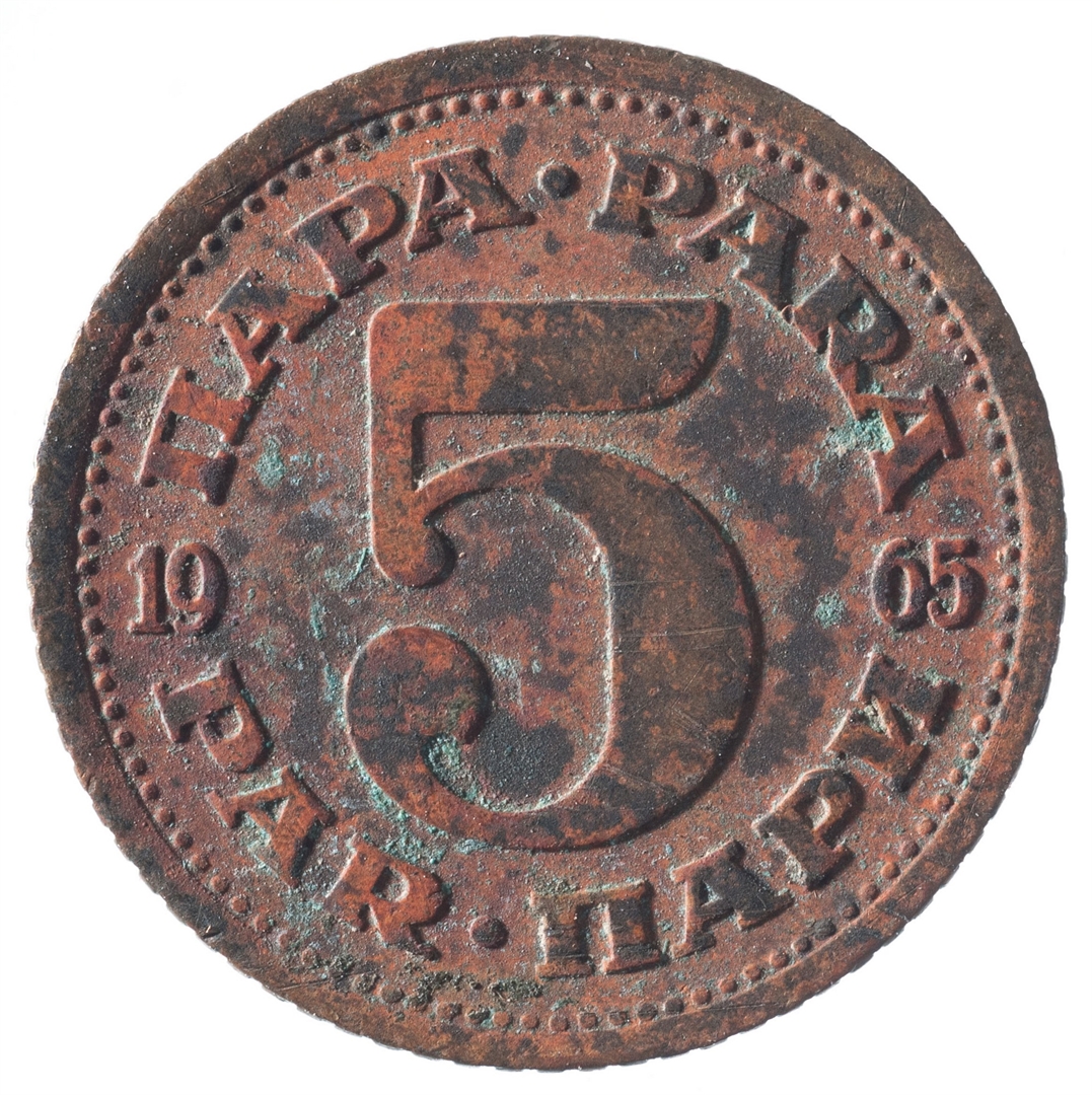 U sredini broj 5 (nominala), a oko njega tekst PARA na četiri jezika. U sredini uz lijevi i desni rub upisana godina 1965.