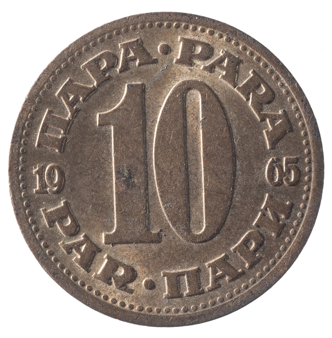 Avers: U sredini državni grb. U gornjem djelu uz rub polukružno napisan tekst SFR JUGOSLAVIJA na latinici i ćirilici. Revers: U sredini broj 10 (nominala), a oko njega tekst PARA na četiri jezika. U sredini uz lijevi i desni rub upisana godina 1965.