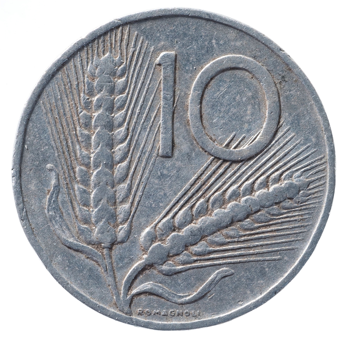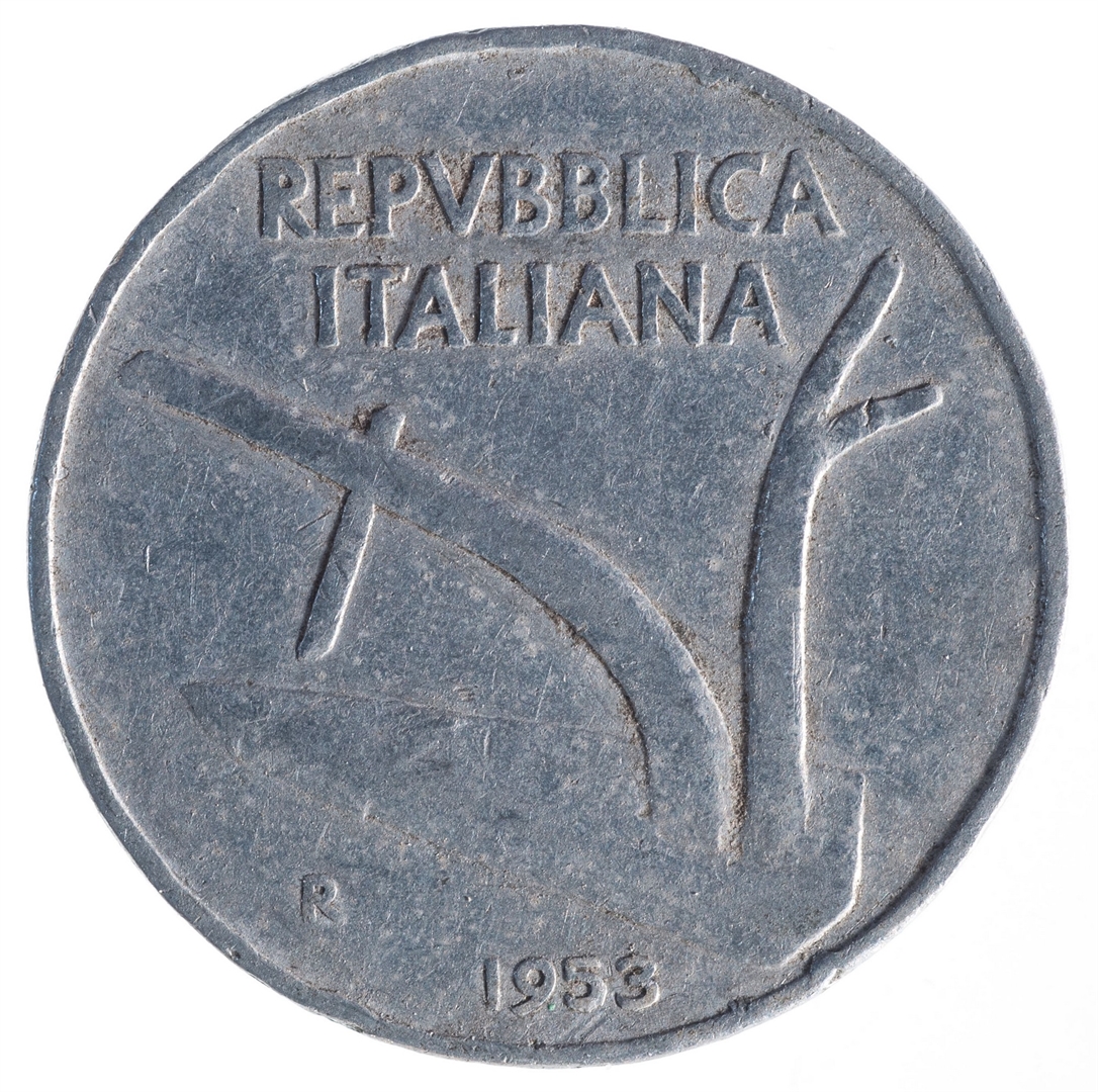 Centralni dio zauzima prikaz pluga iznad kojeg se nalazi tekst u dva reda REPUBLICA ITALIANA. Ispod pluga nalazi se slovo R i godina kovanja.