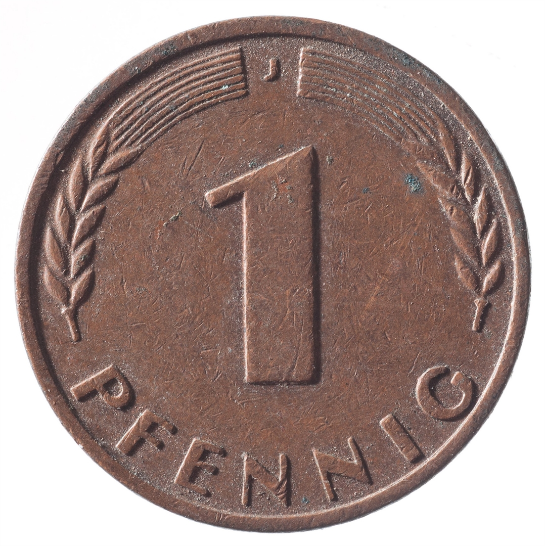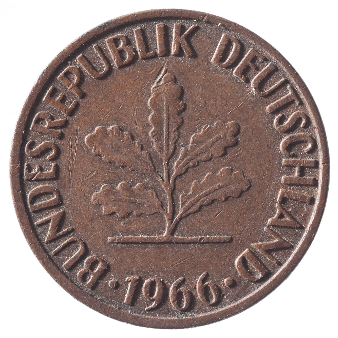Avers: U sredini mladica hrasta s pet listova u vodoravnoj liniji. Uz rub ispisan tekst BUNDESREPUBLIK DEUTSCHLAND i godina 1966. Revers: U sredini broj 1. Na vrhu slovo J (oznaka kovnice), a uz donji rub riječ PFENNIG.