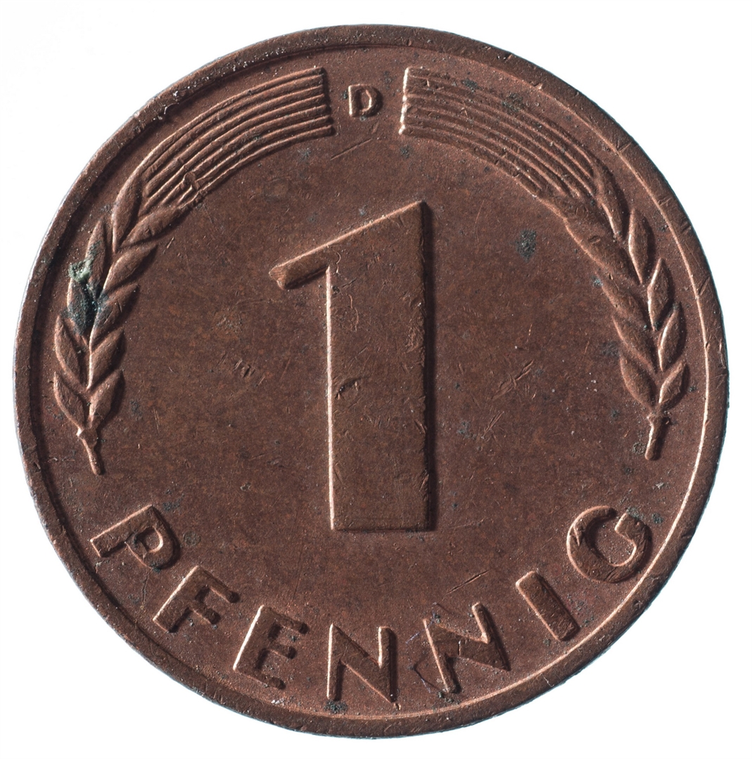 Avers: U sredini mladica hrasta s pet listova u vodoravnoj liniji. Uz rub ispisan tekst BUNDESREPUBLIK DEUTSCHLAND i godina 1966. Revers: U sredini broj 1. Na vrhu slovo D (oznaka kovnice), a uz donji rub riječ PFENNIG