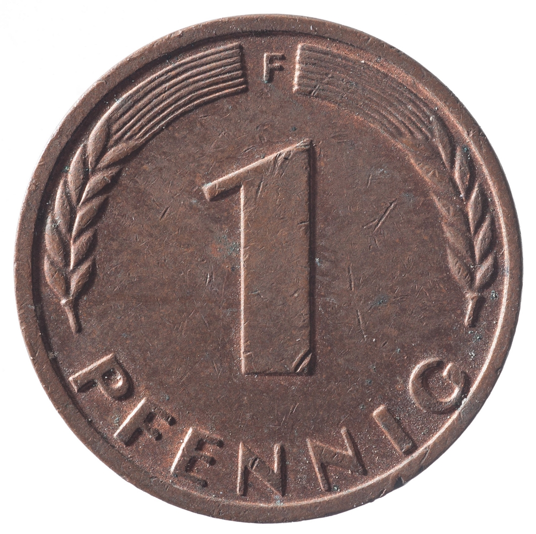 Avers: U sredini mladica hrasta s pet listova u vodoravnoj liniji. Uz rub ispisan tekst BUNDESREPUBLIK DEUTSCHLAND i godina 1966. Revers: U sredini broj 1. Na vrhu slovo F (oznaka kovnice), a uz donji rub riječ PFENNIG.