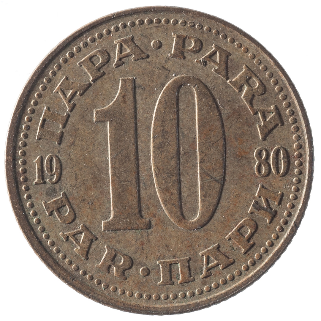 U sredini broj 10 (nominala), a oko njega tekst PARA na četiri jezika. U sredini uz lijevi i desni rub upisana godina 1980.