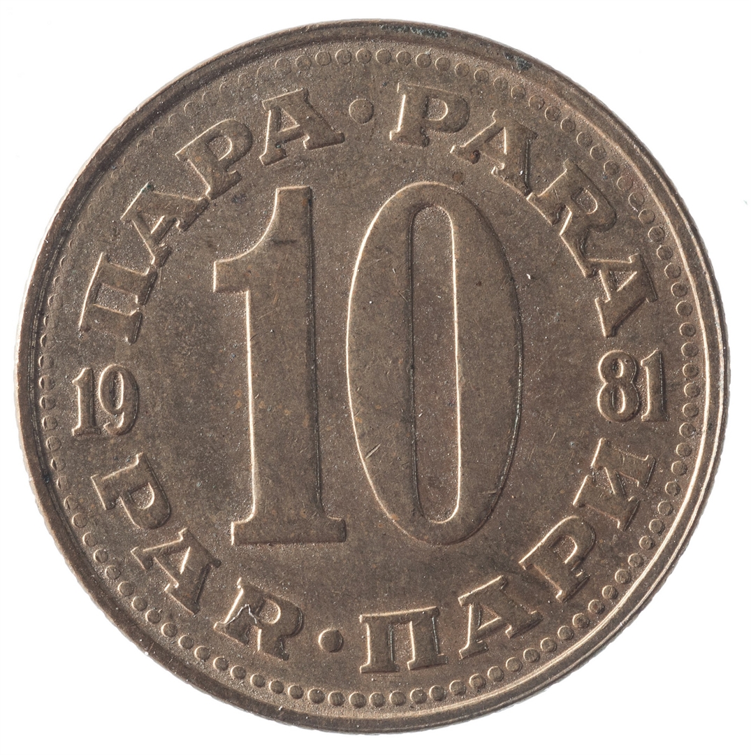 U sredini broj 10 (nominala), a oko njega tekst PARA na četiri jezika. U sredini uz lijevi i desni rub upisana godina 1981.