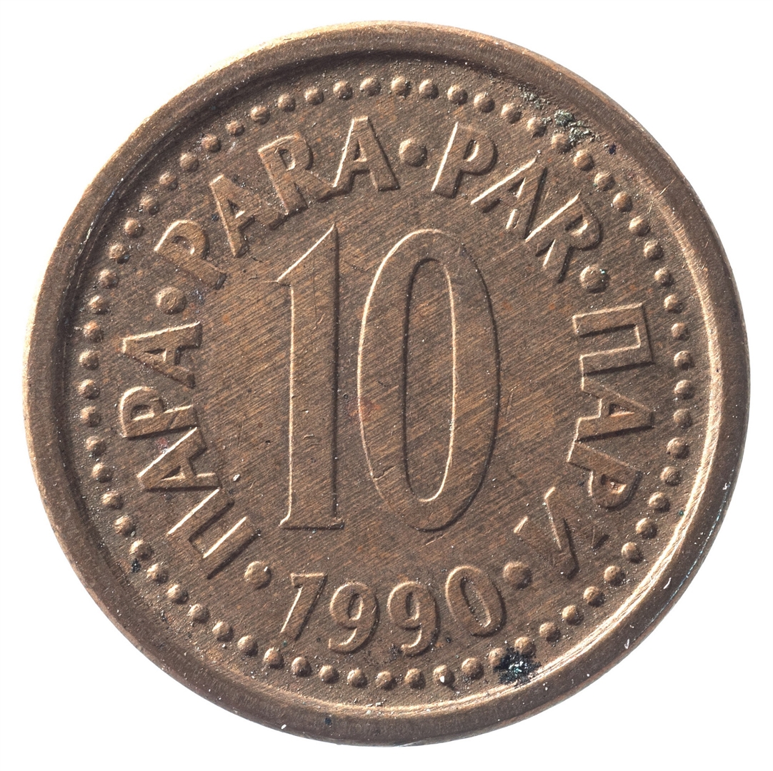 U sredini broj 10 (nominala), oko njega tekst PARA na četiri jezika, a ispod toga godina 1990.