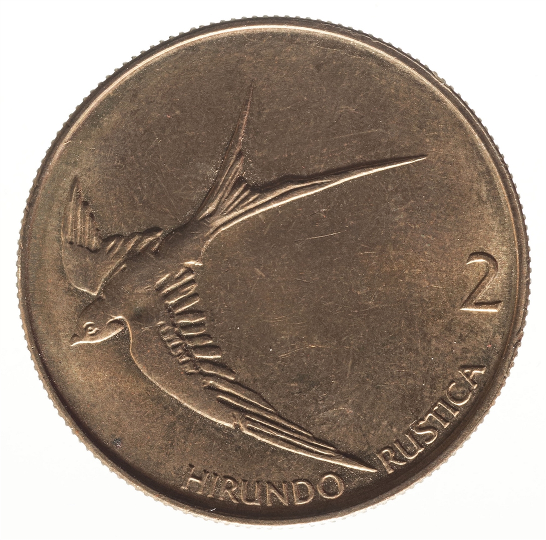 Središnji dio kovanice zauzima prikaz lastavice u letu. Uz desni rub nalazi se broj 2 a ispod njega uz rub tekst HIRUNDO RUSTICA.