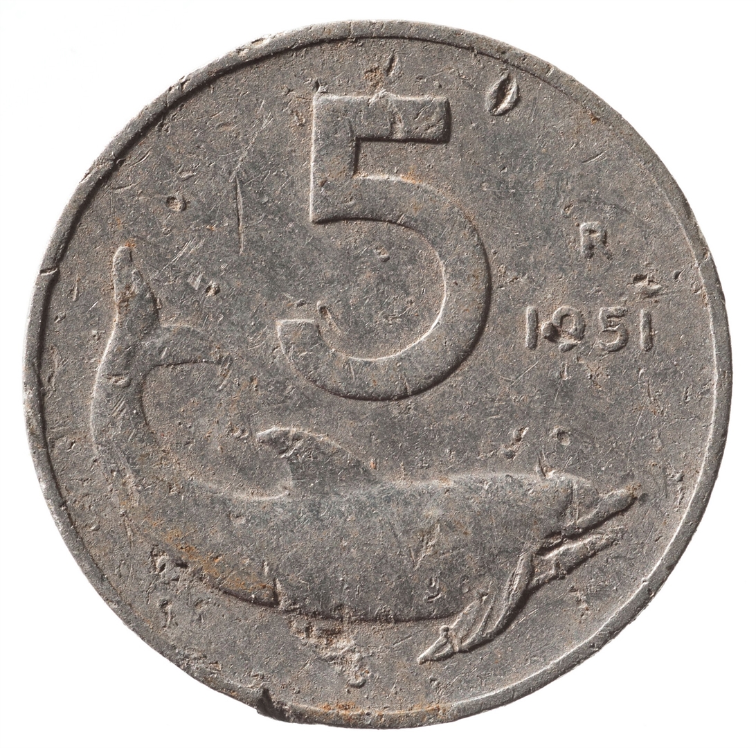 U gornjem djelu veliki broj 5 ispod kojeg se nalazi prikaz delfina. Na desnoj strani slovo P ispod kojeg se nalazi godina kovanja.