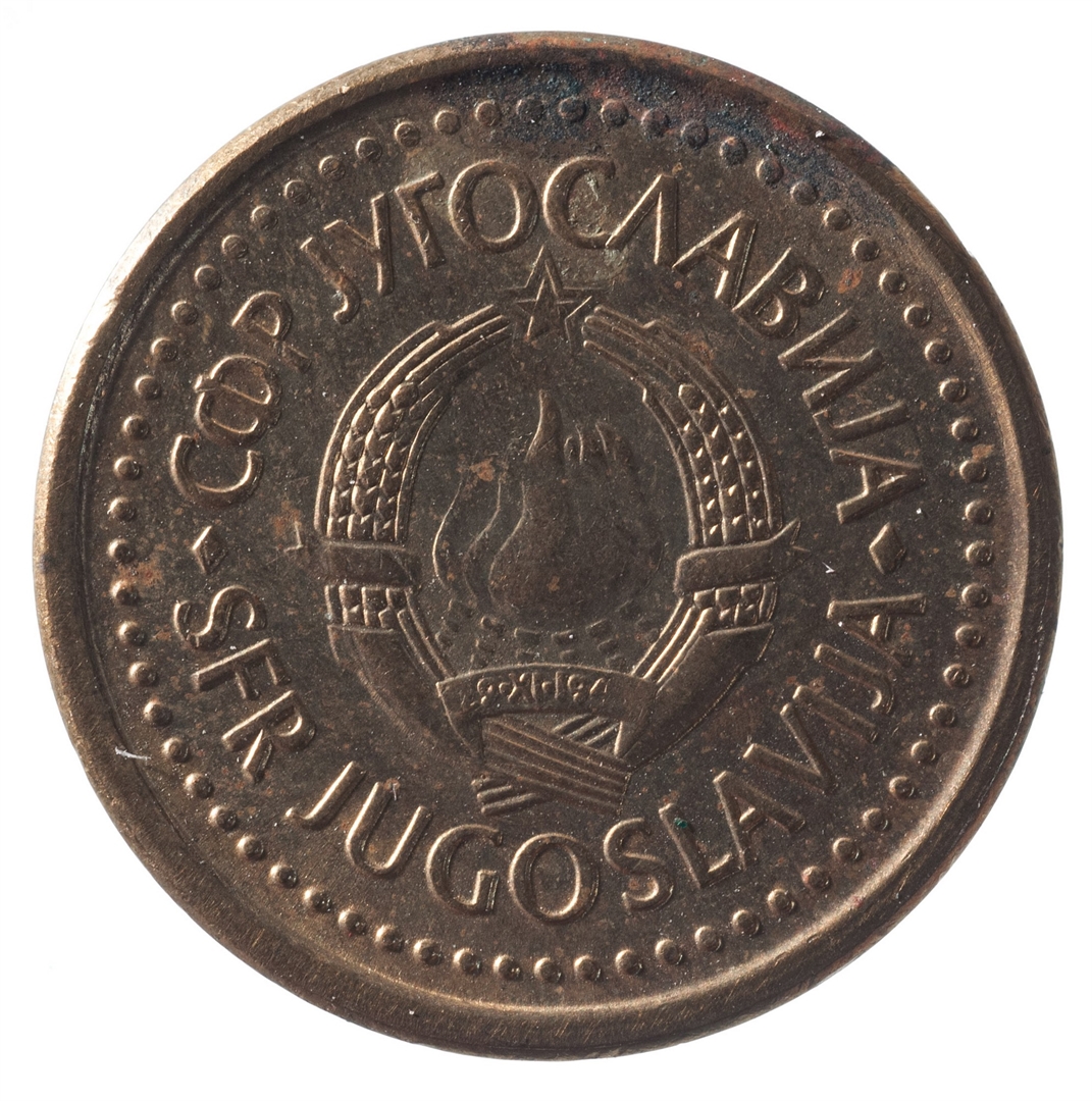 U sredini državni grb. U oko njega uz rub polukružno napisan tekst SFR JUGOSLAVIJA na latinici i ćirilici.