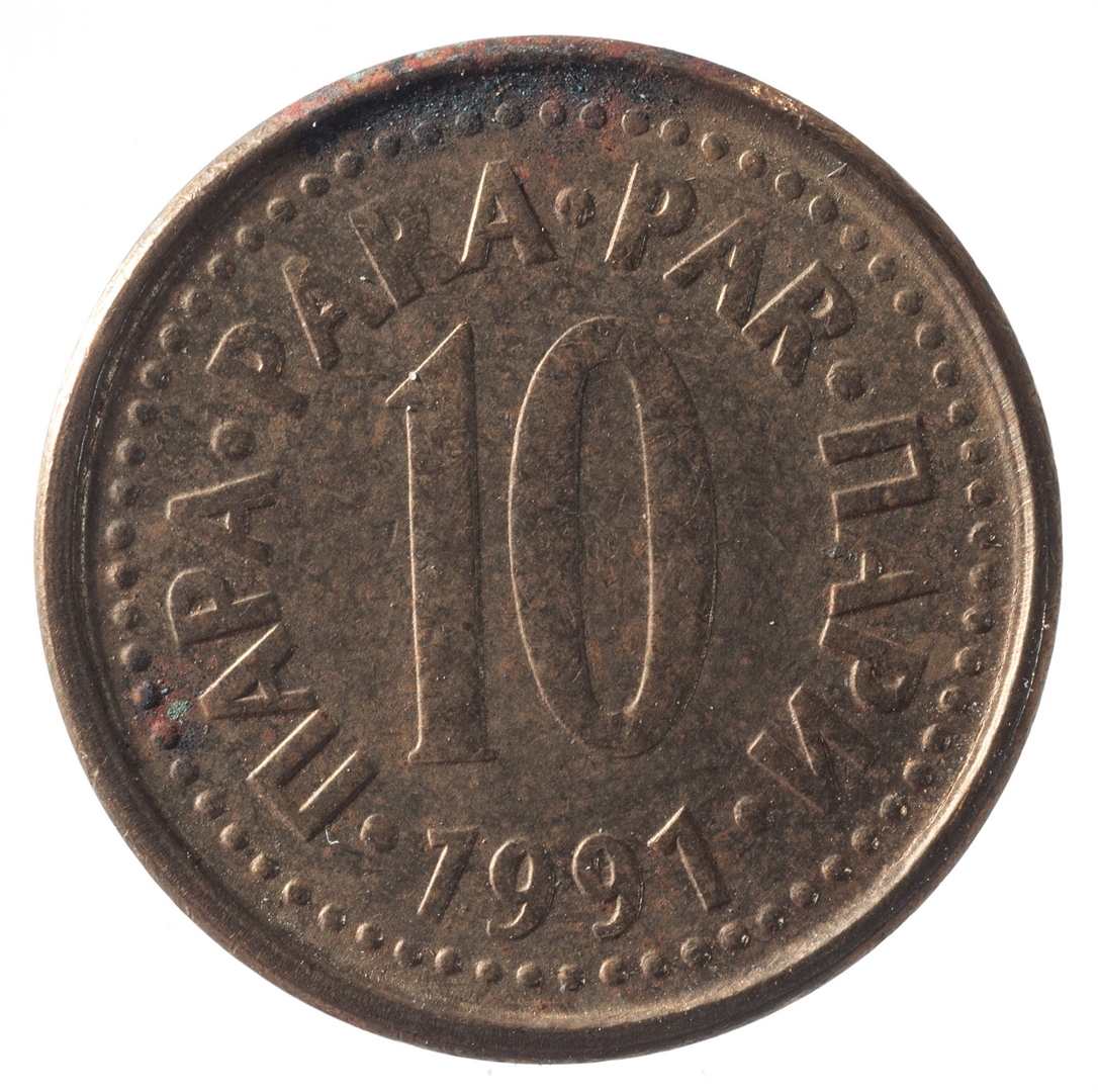 U sredini broj 10 (nominala), oko njega tekst PARA na četiri jezika, a ispod toga godina 1991.