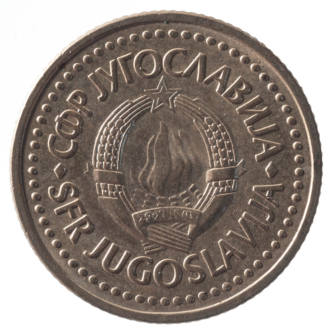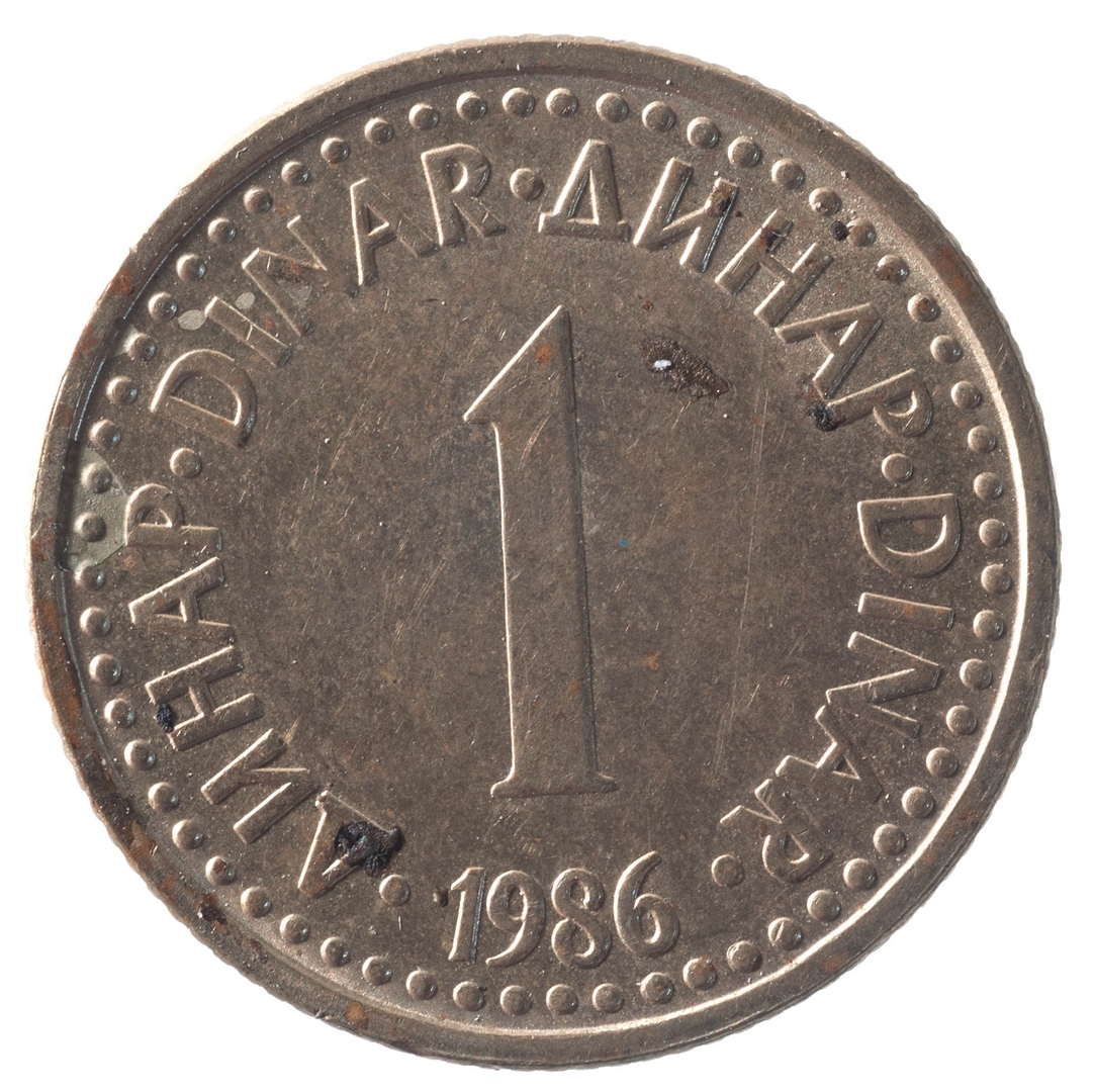U sredini broj 1 (nominala), oko njega tekst DINAR na četiri jezika, a ispod toga godina 1986.