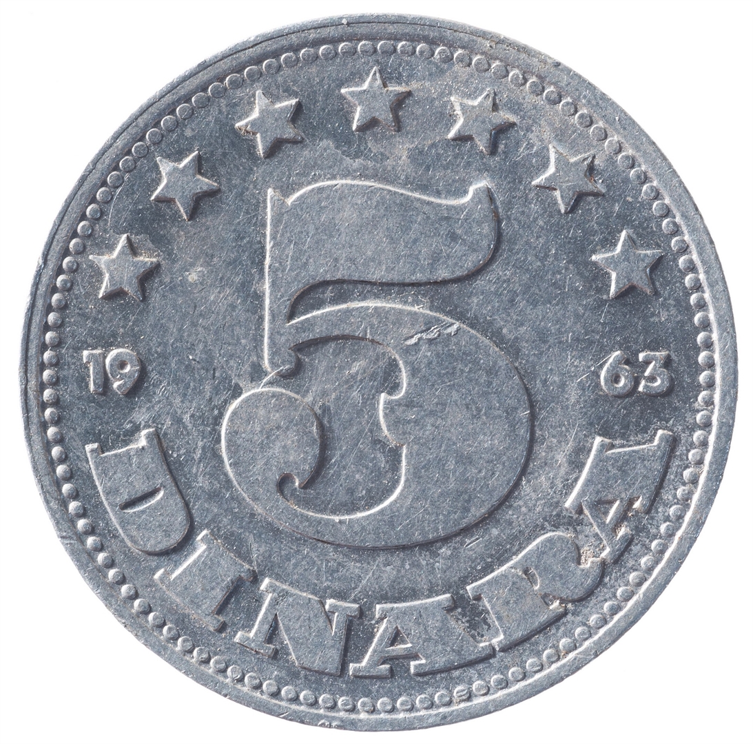 U sredini broj 5 (nominala), a ispod njega tekst DINARA. Duž cijelog gornjeg ruba polukružno poredano 7 petokrakih zvjezdi. U sredini uz lijevi i desni rub upisana godina 1963.