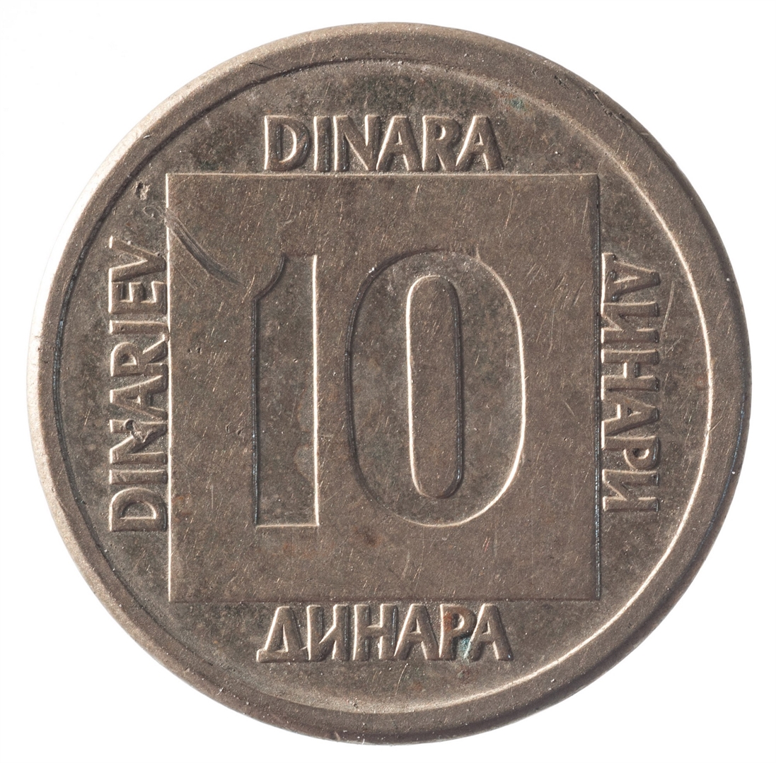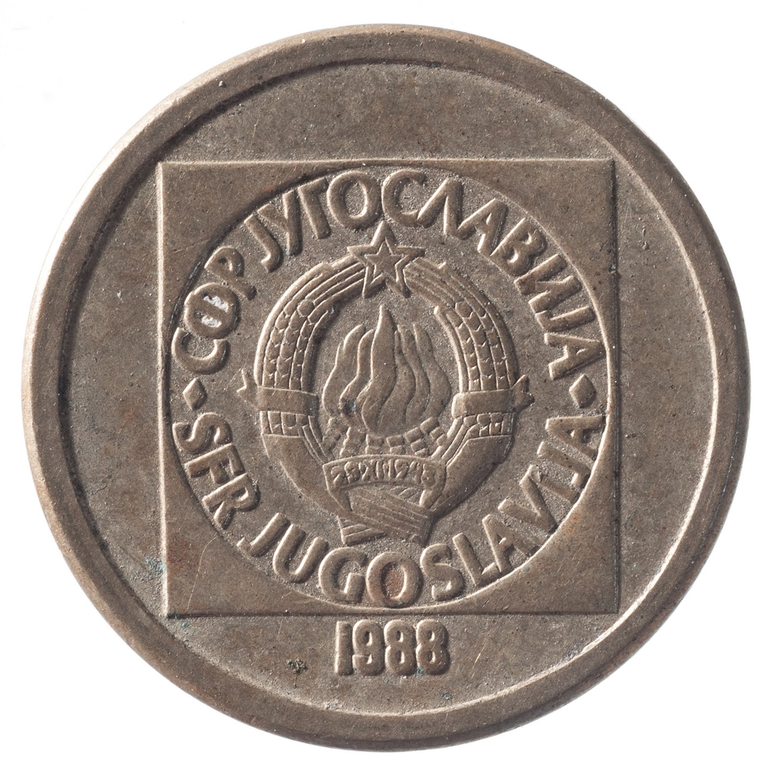Avers: U sredini unutar četverokuta državni grb, a oko njega uz rub polukružno napisan tekst SFR JUGOSLAVIJA na latinici i ćirilici. Ispod godina 1988. Revers: U sredini četverokuta broj 10 (nominala), oko njega tekst DINAR na četiri jezika.