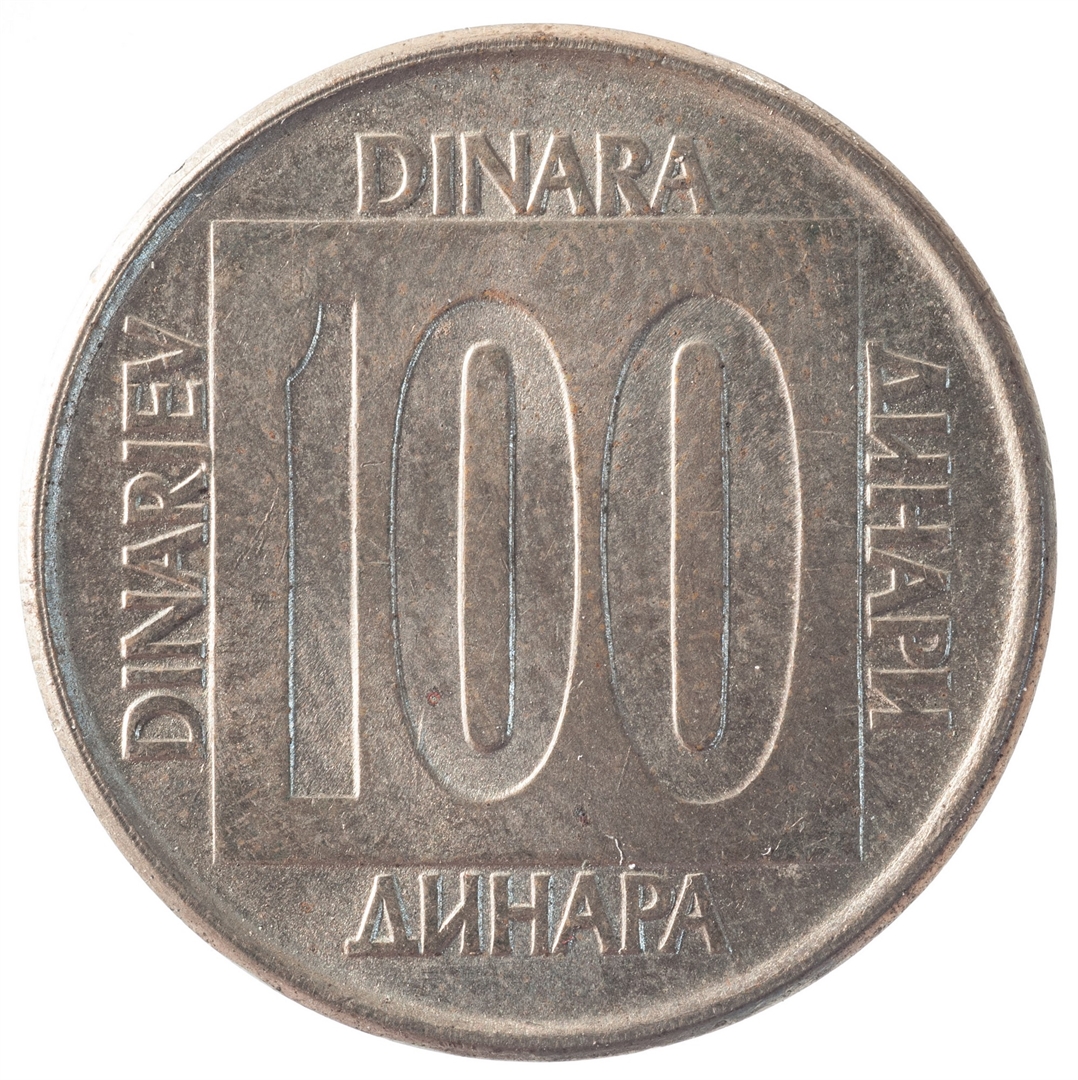 U sredini četverokuta broj 100 (nominala), oko njega tekst DINAR na četiri jezika.