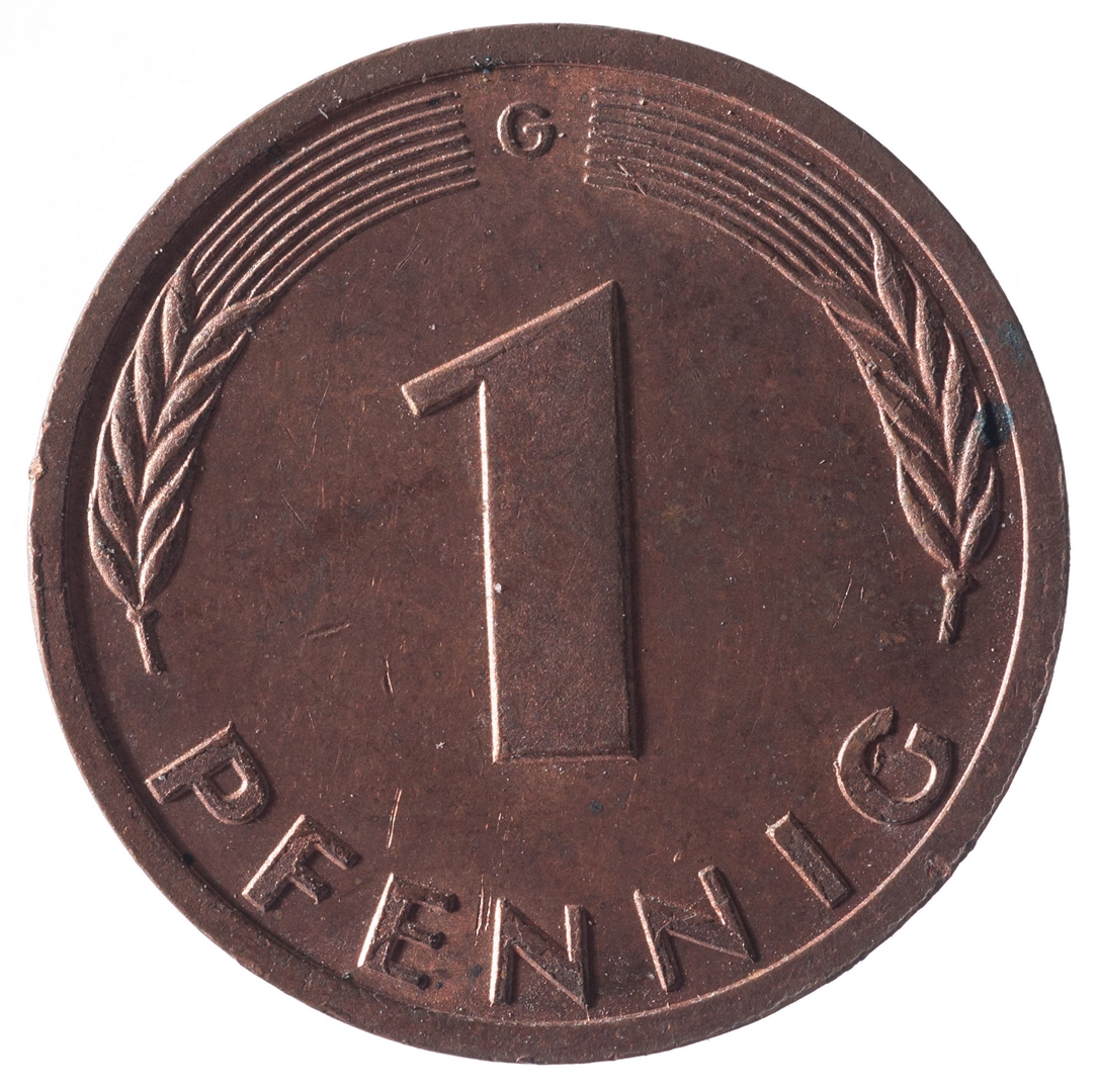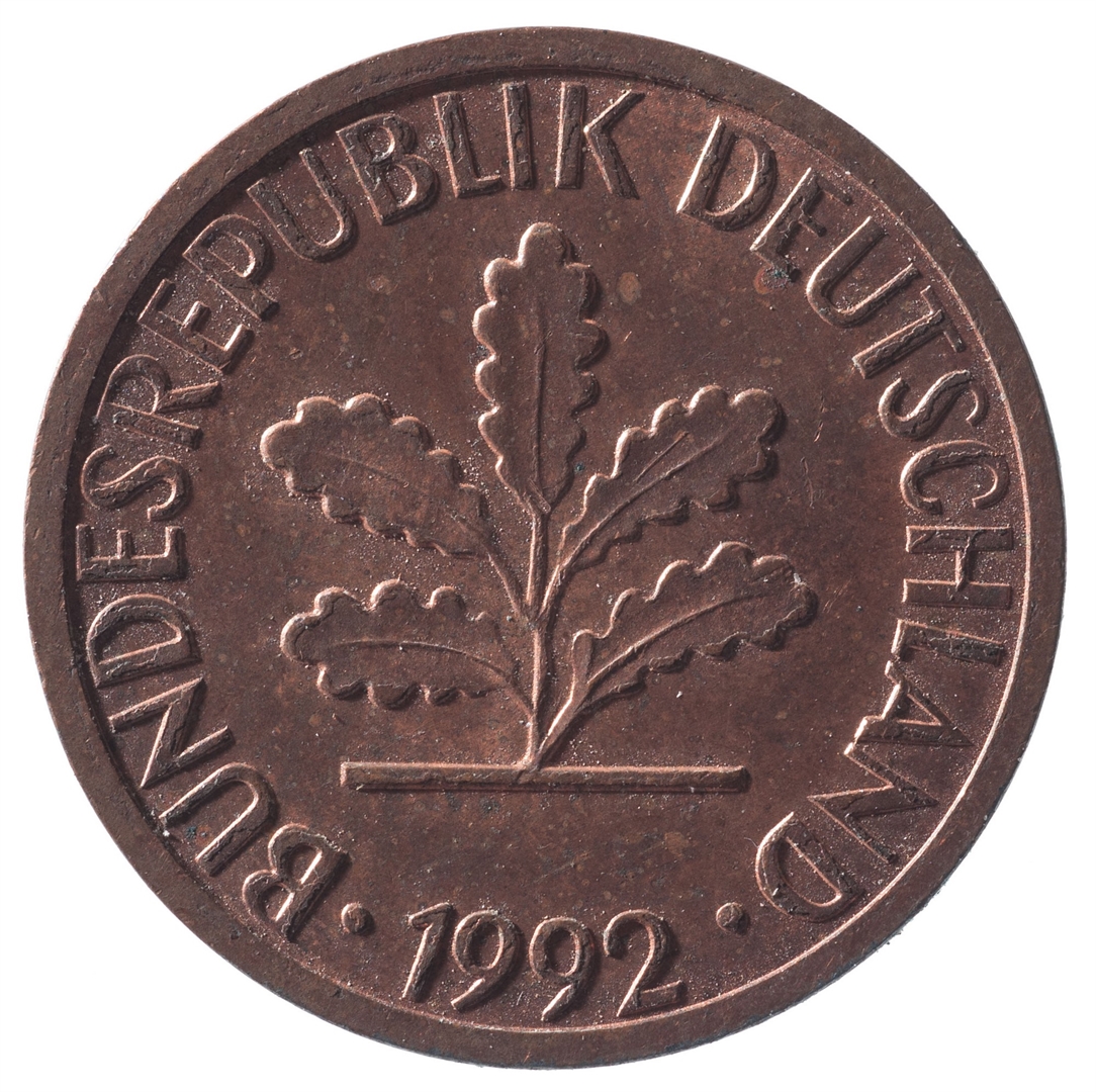 Avers: U sredini mladica hrasta s pet listova u vodoravnoj liniji. Uz rub ispisan tekst BUNDESREPUBLIK DEUTSCHLAND i godina 1992. Revers: U sredini broj 1. Na vrhu slovo G (oznaka kovnice), a uz donji rub riječ PFENNIG.