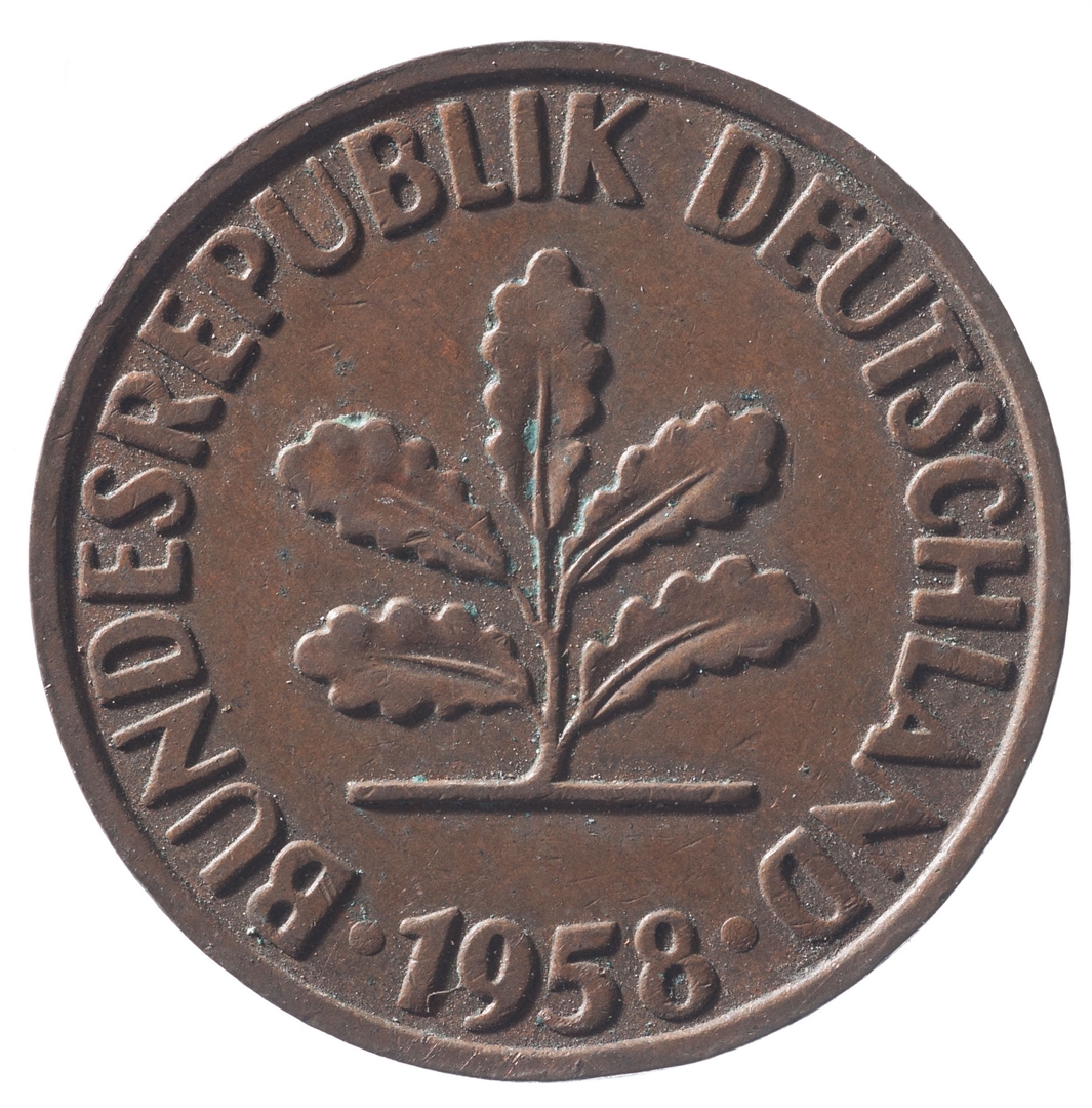 Avers: U sredini mladica hrasta s pet listova u vodoravnoj liniji. Uz rub ispisan tekst BUNDESREPUBLIK DEUTSCHLAND i godina 1958. Revers: U sredini broj 2. Na vrhu slovo J (oznaka kovnice), a uz donji rub riječ PFENNIG.