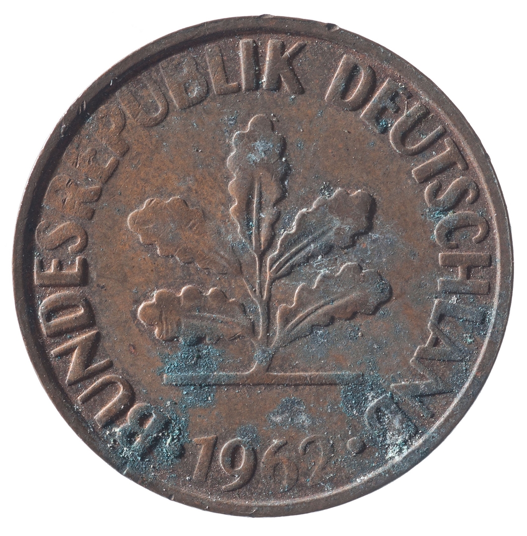 Avers: U sredini mladica hrasta s pet listova u vodoravnoj liniji. Uz rub ispisan tekst BUNDESREPUBLIK DEUTSCHLAND i godina 1962. Revers: U sredini broj 2. Na vrhu slovo G (oznaka kovnice), a uz donji rub riječ PFENNIG.