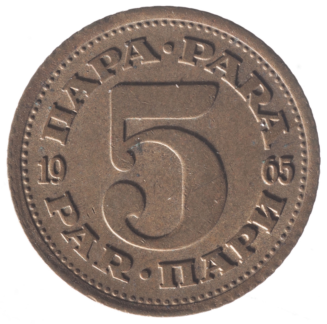U sredini broj 5 (nominala), a oko njega tekst PARA na četiri jezika. U sredini uz lijevi i desni rub upisana godina 1965.