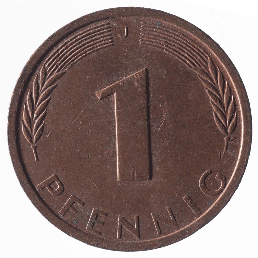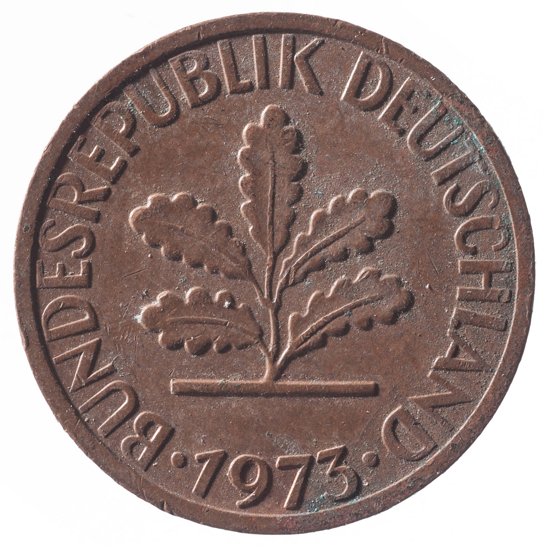Avers: U sredini mladica hrasta s pet listova u vodoravnoj liniji. Uz rub ispisan tekst BUNDESREPUBLIK DEUTSCHLAND i godina 1973. Revers: U sredini broj 1. Na vrhu slovo J (oznaka kovnice), a uz donji rub riječ PFENNIG.