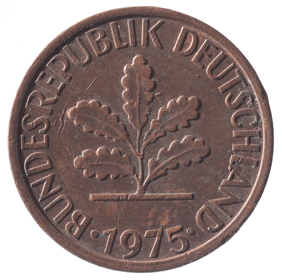U sredini mladica hrasta s pet listova u vodoravnoj liniji. Uz rub ispisan tekst BUNDESREPUBLIK DEUTSCHLAND i godina 1975.