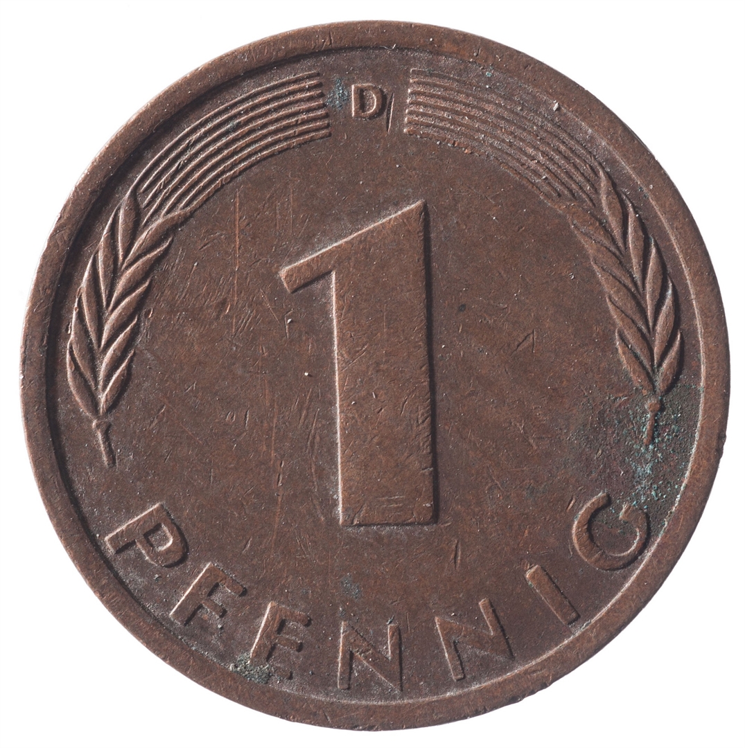 U sredini broj 1. Na vrhu slovo D (oznaka kovnice), a uz donji rub riječ PFENNIG.