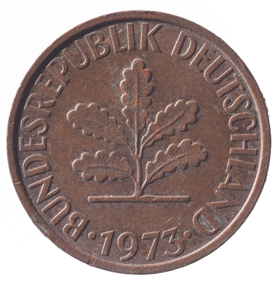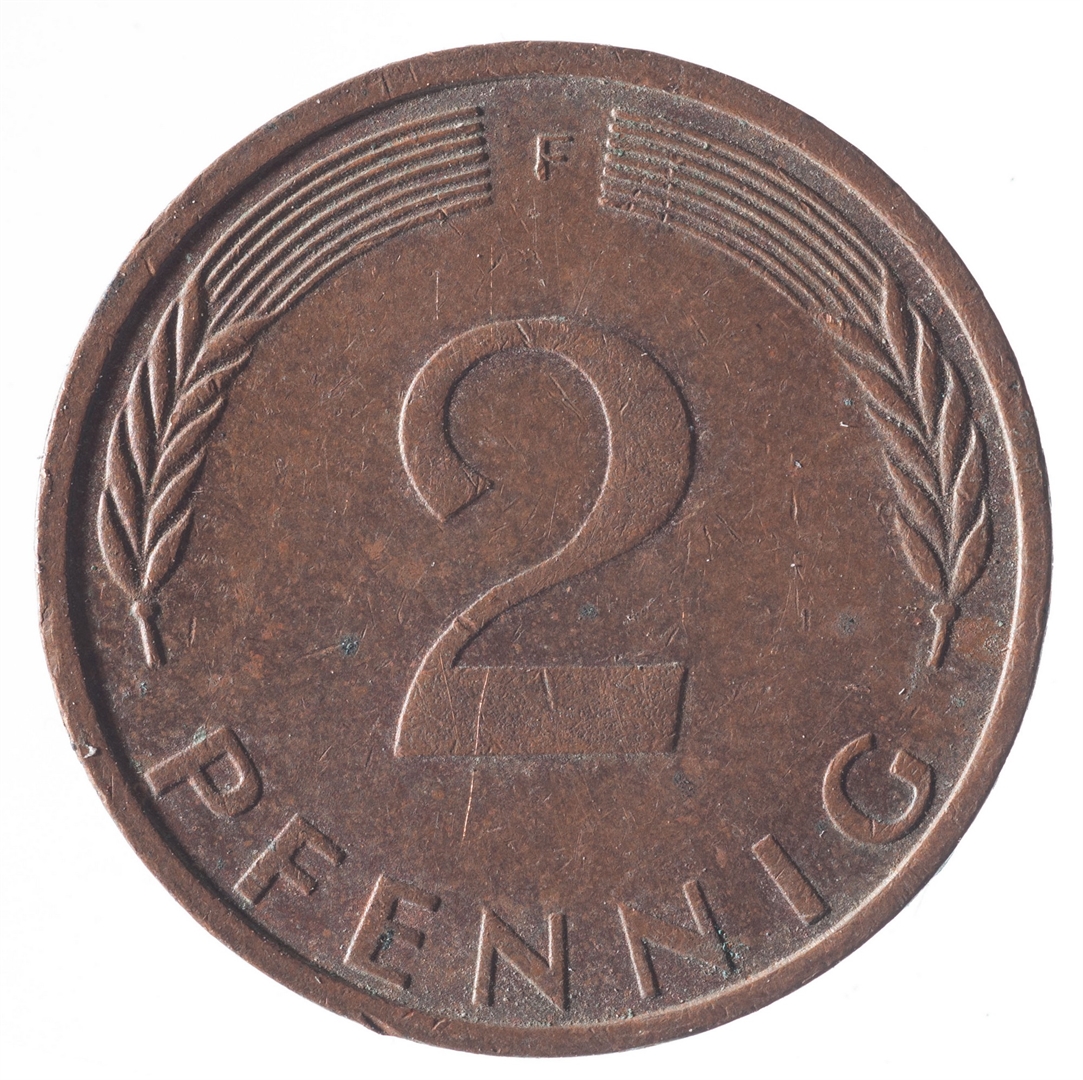 Avers: U sredini mladica hrasta s pet listova u vodoravnoj liniji. Uz rub ispisan tekst BUNDESREPUBLIK DEUTSCHLAND i godina 1973. Revers: U sredini broj 2. Na vrhu slovo F (oznaka kovnice), a uz donji rub riječ PFENNIG.