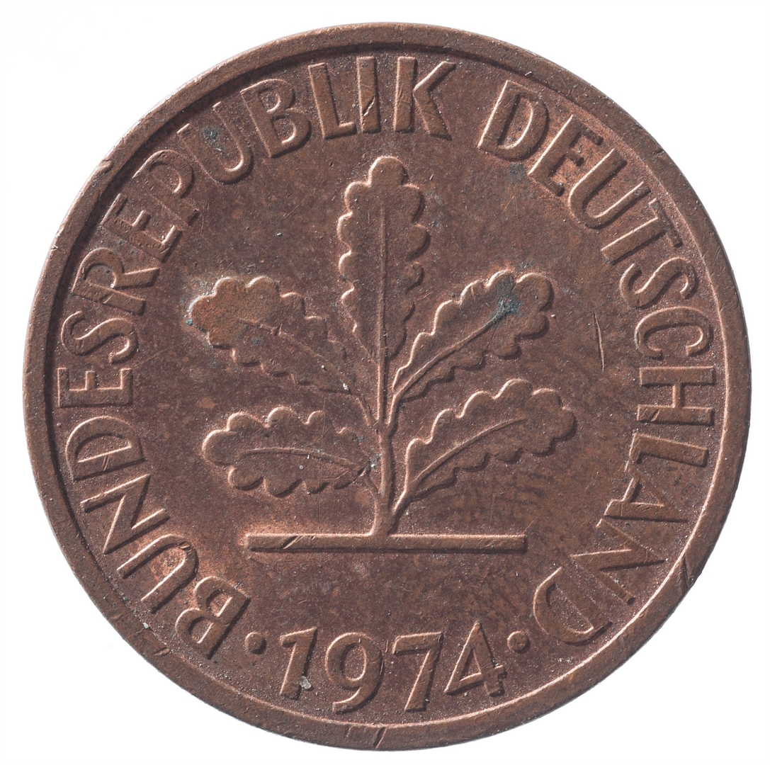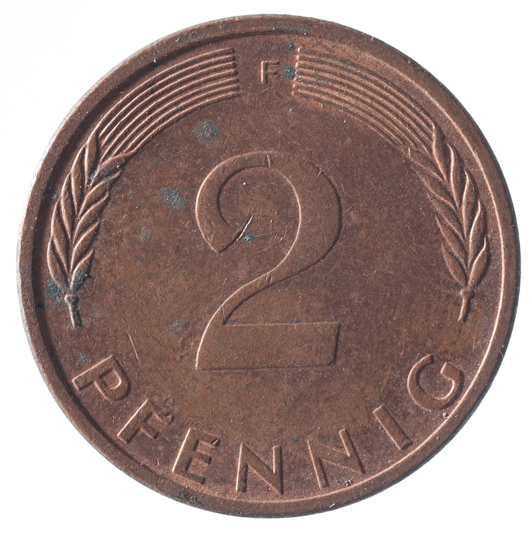 Avers: U sredini mladica hrasta s pet listova u vodoravnoj liniji. Uz rub ispisan tekst BUNDESREPUBLIK DEUTSCHLAND i godina 1974. Revers: U sredini broj 2. Na vrhu slovo F (oznaka kovnice), a uz donji rub riječ PFENNIG.