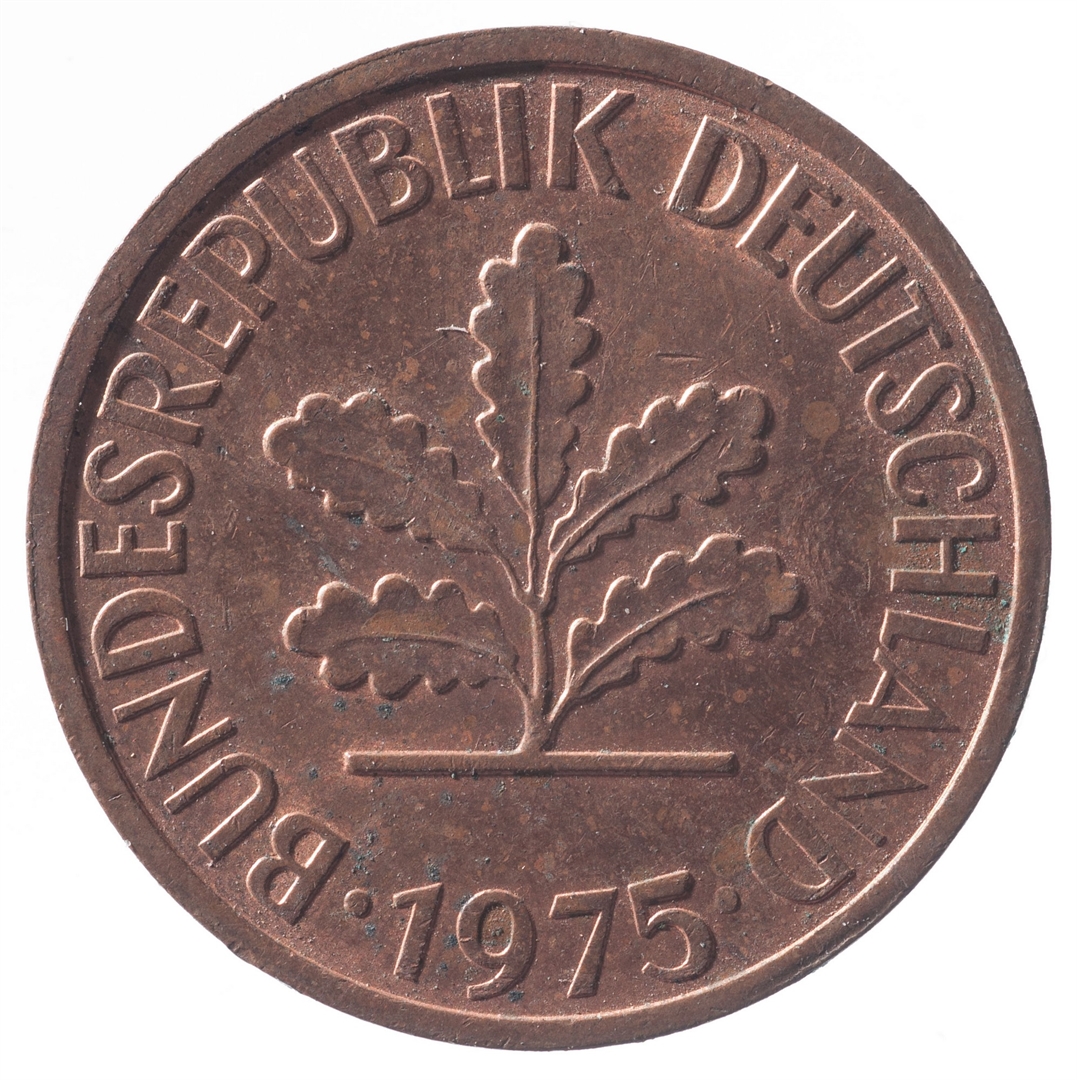 U sredini mladica hrasta s pet listova u vodoravnoj liniji. Uz rub ispisan tekst BUNDESREPUBLIK DEUTSCHLAND i godina 1975.