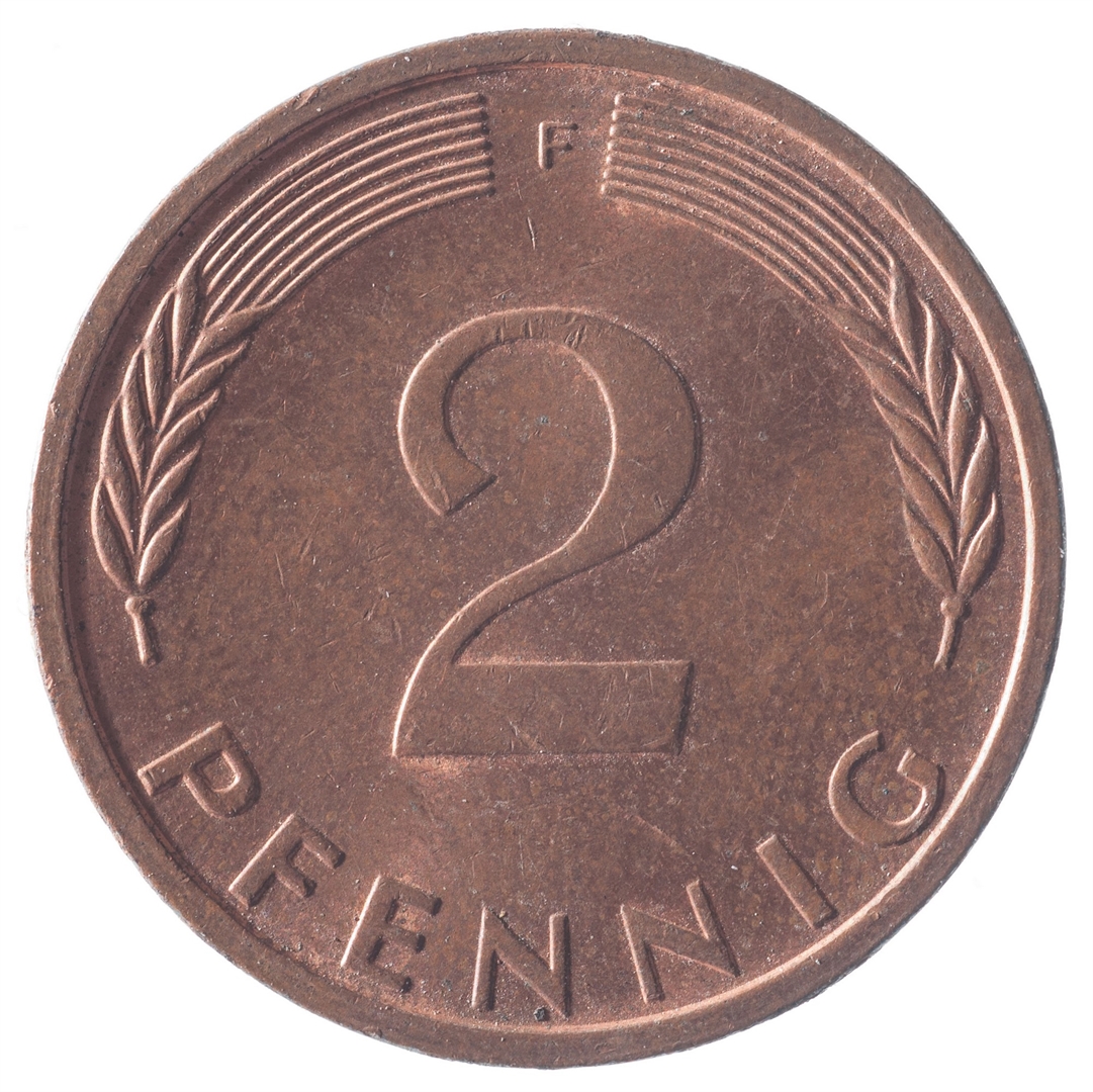 U sredini broj 2. Na vrhu slovo F (oznaka kovnice), a uz donji rub riječ PFENNIG.