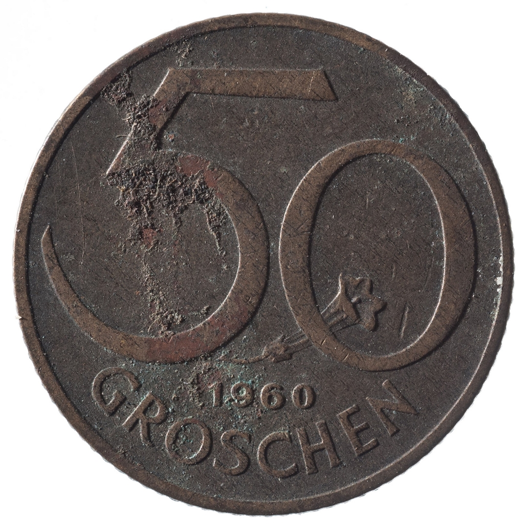 Veliki broj 50 u čijem se dnu nalazi cvijet. Ispod godina kovanja (1960) i tekst GROSCHEN.