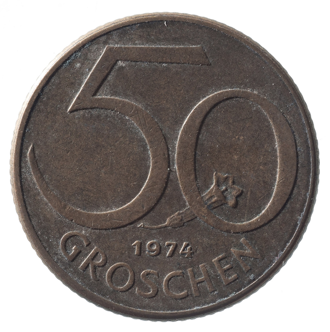Avers: U sredini državni grb. Kružno uz rub tekst REPUBLIK ''O''STERREICH. Revers: Veliki broj 50 u čijem se dnu nalazi cvijet. Ispod godina kovanja (1974) i tekst GROSCHEN.