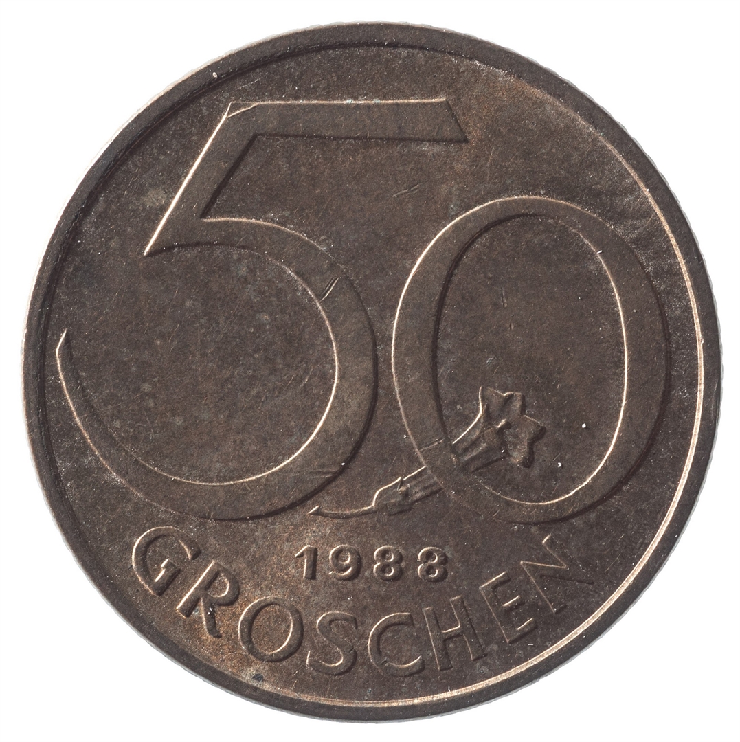 Avers: U sredini državni grb. Kružno uz rub tekst REPUBLIK ''O''STERREICH. Revers: Veliki broj 50 u čijem se dnu nalazi cvijet. Ispod godina kovanja (1988) i tekst GROSCHEN.