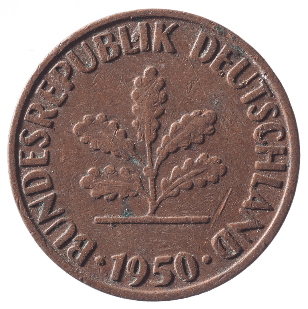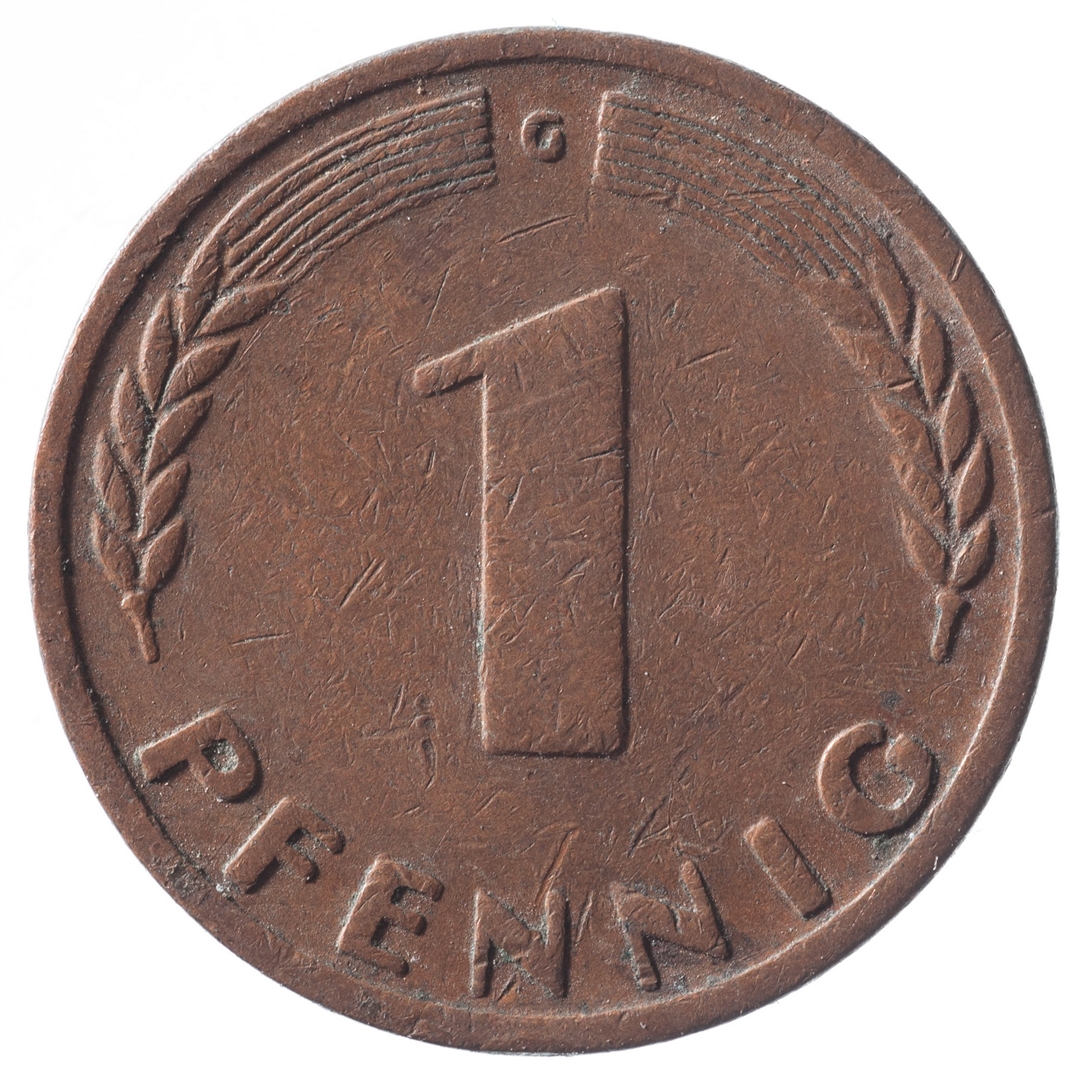 Avers: U sredini mladica hrasta s pet listova u vodoravnoj liniji. Uz rub ispisan tekst BUNDESREPUBLIK DEUTSCHLAND i godina 1950. Revers: U sredini broj 1. Na vrhu slovo G (oznaka kovnice), a uz donji rub riječ PFENNIG.