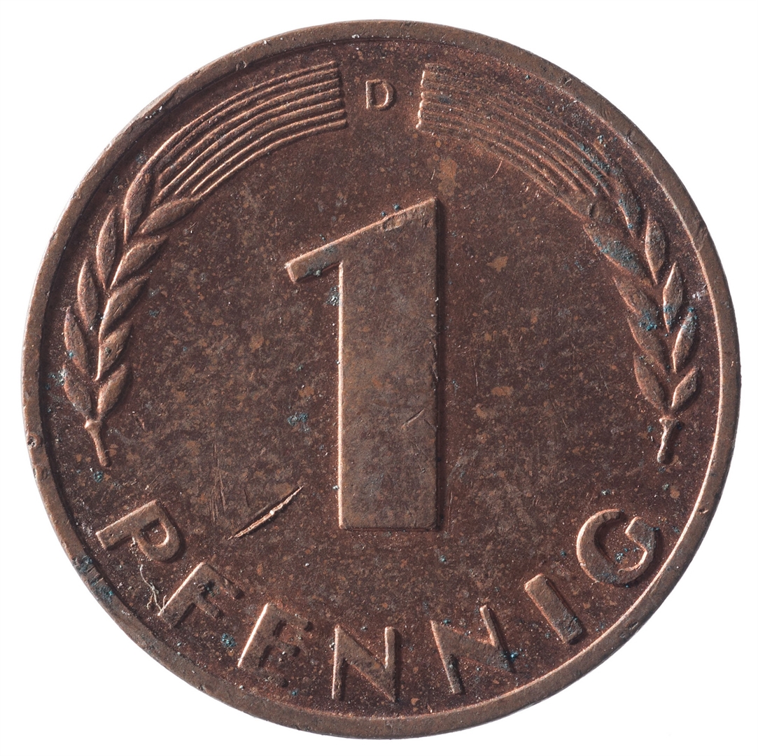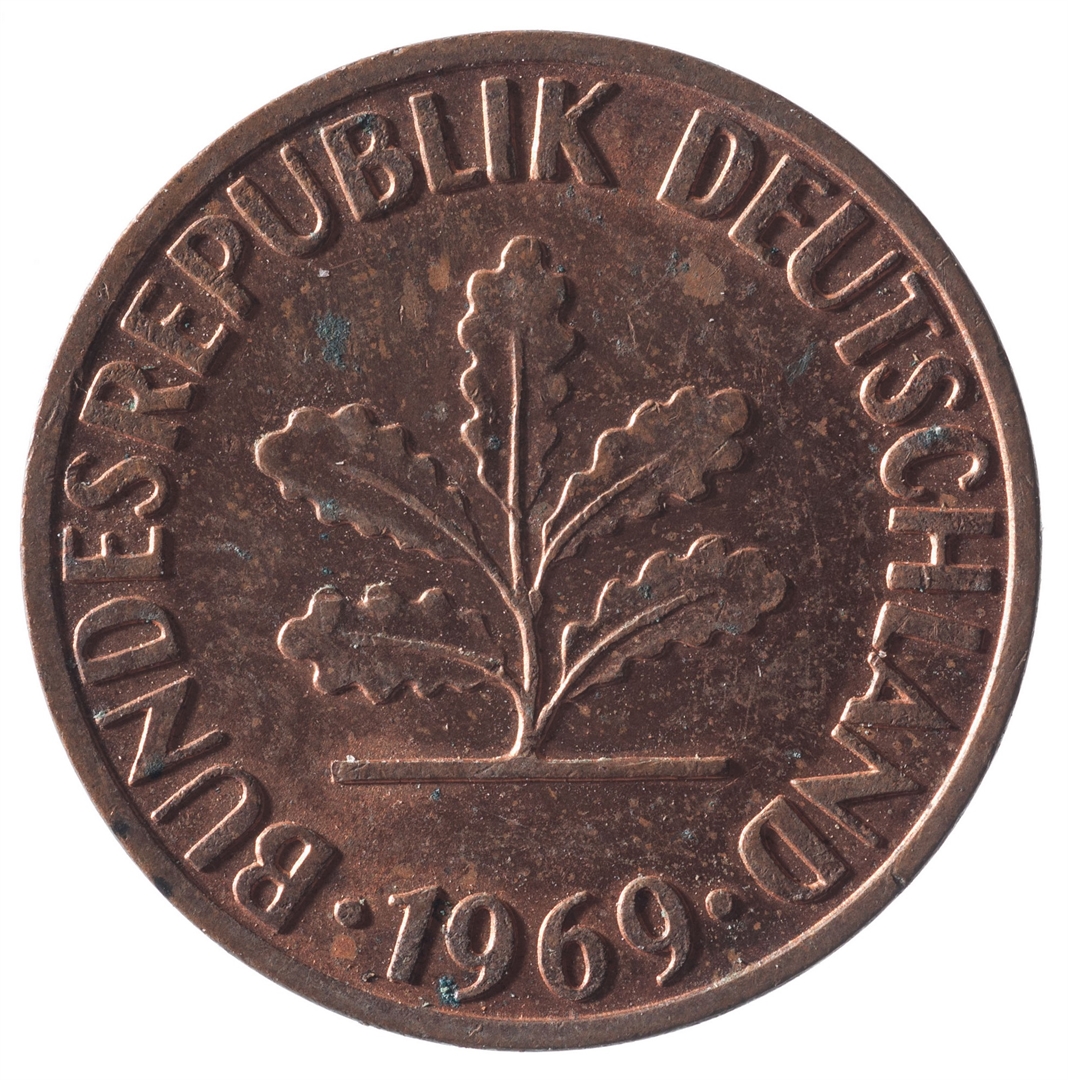 Avers: U sredini mladica hrasta s pet listova u vodoravnoj liniji. Uz rub ispisan tekst BUNDESREPUBLIK DEUTSCHLAND i godina 1969. Revers: U sredini broj 1. Na vrhu slovo D (oznaka kovnice), a uz donji rub riječ PFENNIG.